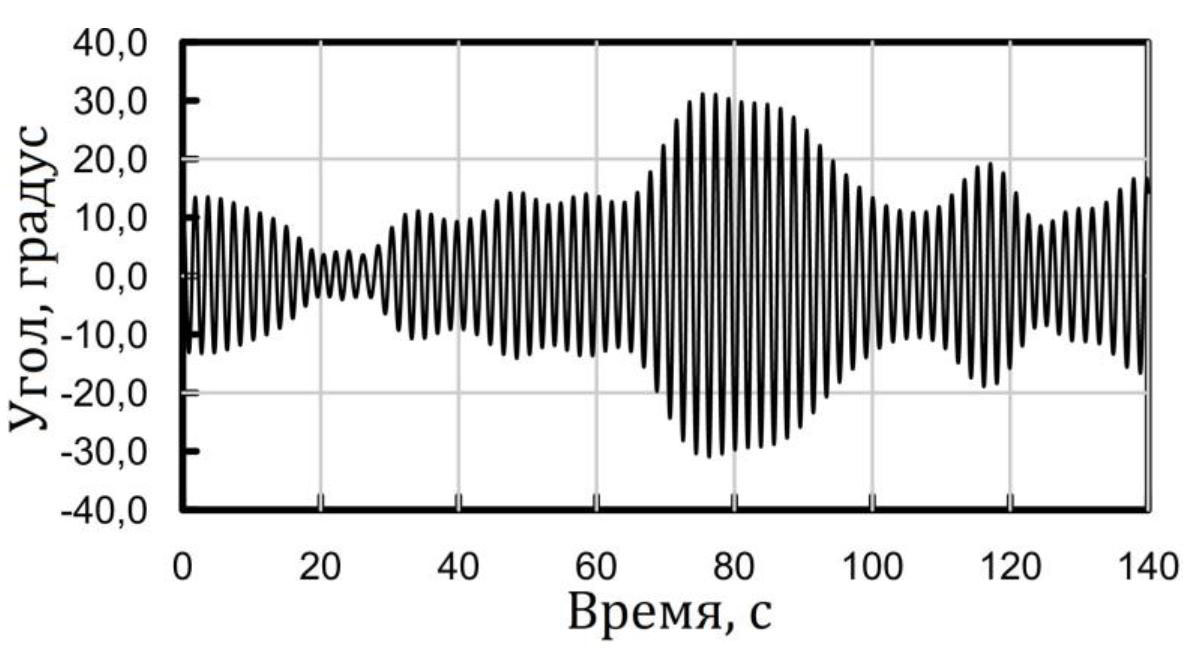 Рис. 14. Фрагмент записанной реализации бортовой качки модели в реальном времени при воспроизведении в бассейне нерегулярных волн со спектром № 2, имеющим τp = 1,89 с, hs = 44,69 мм
