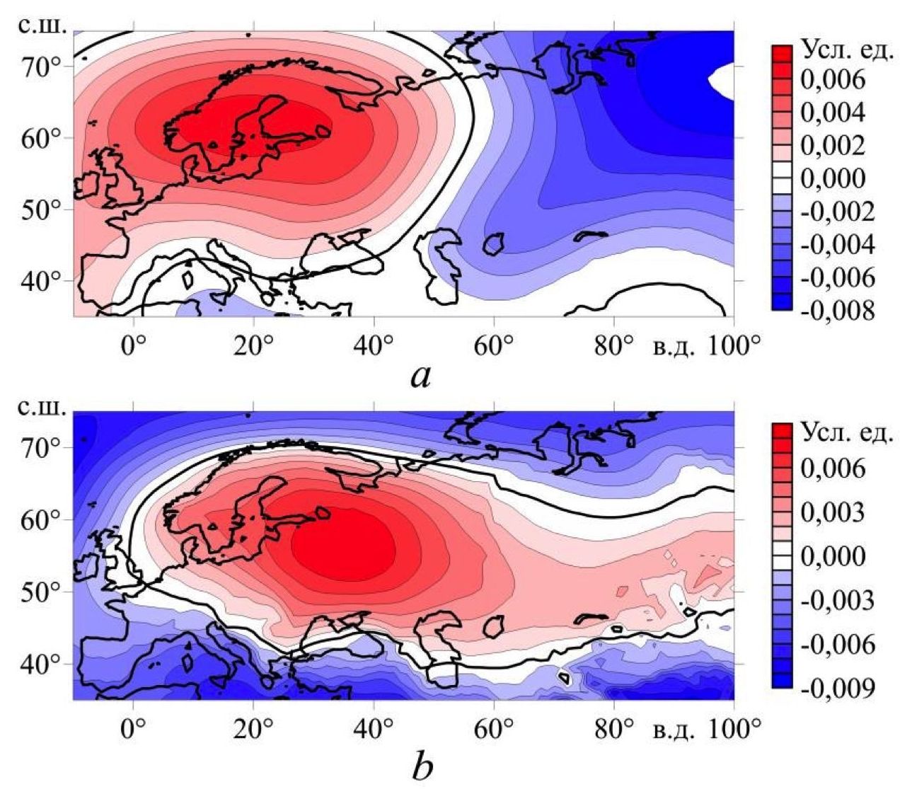 Р и с. 1. Распределение первых мод аномалий геопотенциальной высоты изобарической поверхности 500гПа (а) и поля приземного давления (b) для случаев с устойчивыми северными, северо-восточными и восточными ветрами в холодный период года