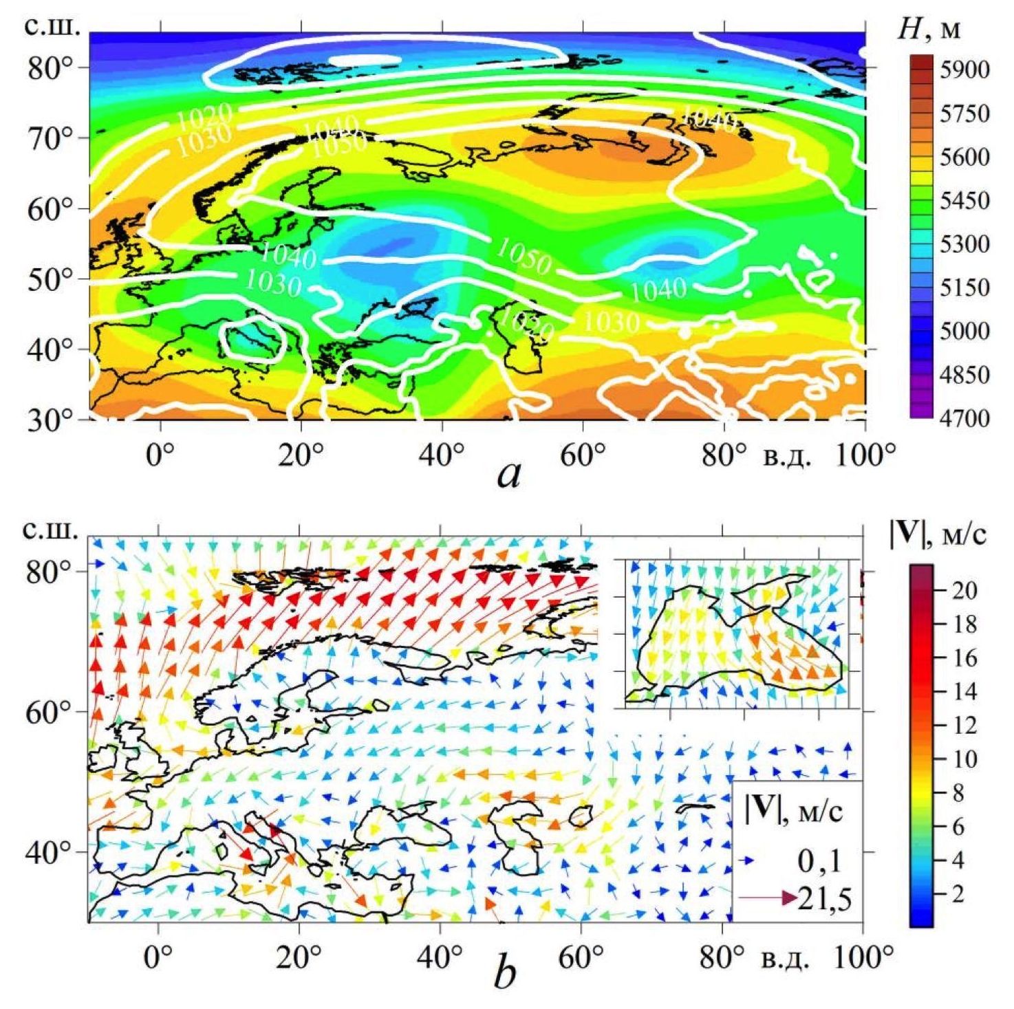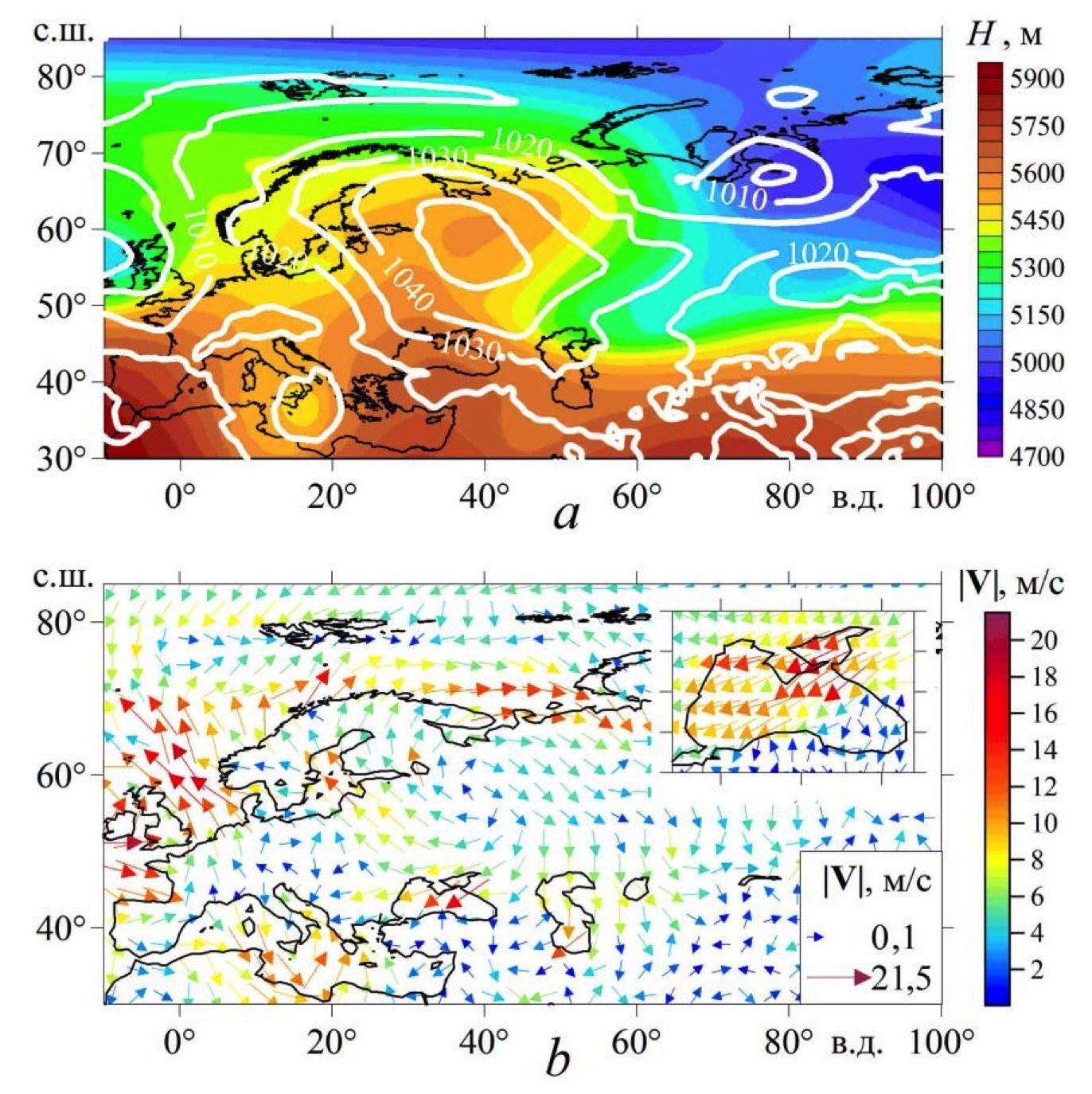 Р и с. 2. Распределение геопотенциальной высоты изобарической поверхности 500 гПа, приземного давления (гПа, изолинии белого цвета) (а) и поля ветра на высоте 10 м (b) для 07.12.1995, 12:00 (случай с продолжительным северо-восточным ветром)