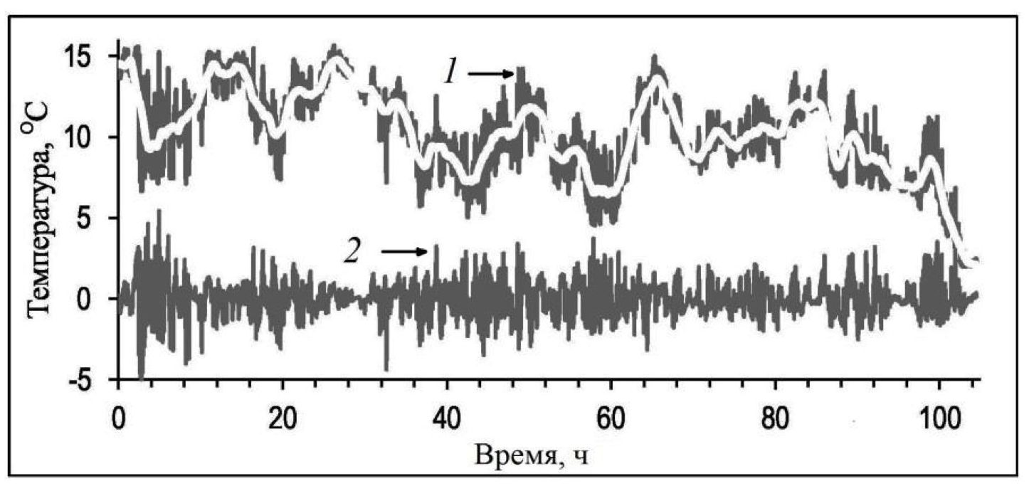 На рис. 2 показаны 5-суточная реализация температуры на горизонте z = –24 м, зарегистрированной термографом ПБС, и ее низкочастотный тренд. Здесь же представлена реализация высокочастотных колебаний температуры.