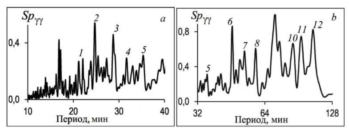 Рассмотрим приведенные на рис. 4, b, c спектры, полученные в 2001 г. по двум последовательным 7-суточным реализациям. В диапазоне периодов 16–128 мин цифрами 1, 2, …, 7 пронумерованы соответствующие максимумы. Приведем значения периодов, на которых эти максимумы располагаются: