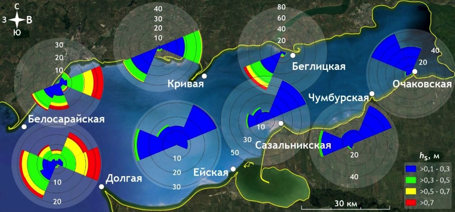 Степень развития ветрового волнения зависит от множества факторов: силы, устойчивости по направлению и времени действия ветрового потока, длины разгона, батиметрических особенностей. В нашем случае наиболее сильное ветровое волнение проявляется на входе в Таганрогский залив, а также в районе косы Беглицкой (рис. 4).