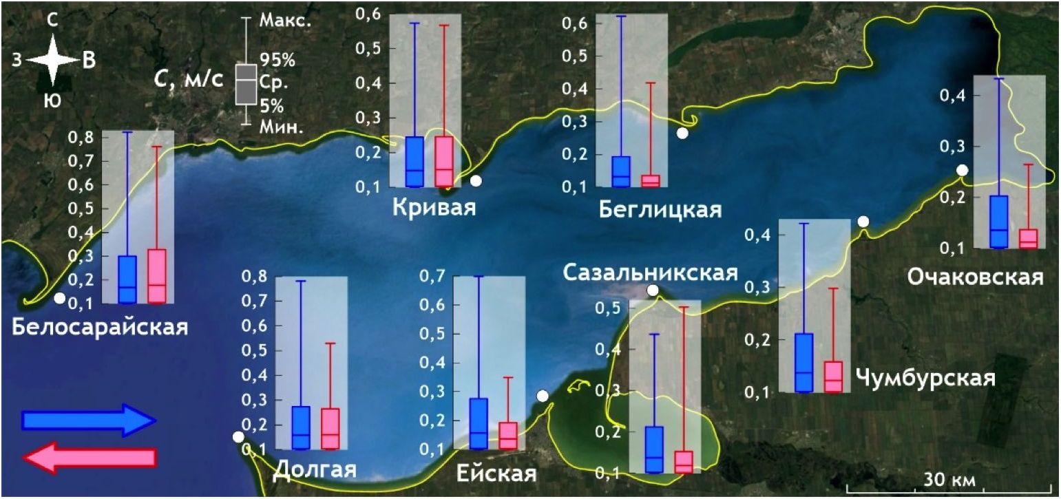 Conclusions. In the coastal waters of the Belosarayskaya and Krivaya spits (the northern coast), the frequency of currents from the east prevails. The Beglitskaya (the northern coast), Ochakovskaya and Sazalnikskaya (the southern coast) spits are characterized by the predominance of currents from the west. In the region of the Belosarayskaya and Krivaya spits, the long-term mean velocities of the currents directed to the east are slightly higher than those of the currents directed to the west. In the areas of the Beglitskaya spit (the northern coast), as well as the Ochakovskaya, Chumburskaya, Sazalnikskaya and Yeyskaya spits in the southern part of the bay, the eastward directed currents dominate noticeably, both in terms of mean and maximum speeds. In the coastal waters of the Belosarayskaya and Krivaya spits, both the mean and maximum heights of the waves propagating to the east slightly exceed those of the waves propagating to the west. As for the Beglitskaya, Ochakovskaya, Chumburskaya, Sazalnikskaya and Yeyskaya spits, the dominating westward direction of wave propagation is, on average, a characteristic feature, whereas the waves of maximum heights develop during the eastern storms.