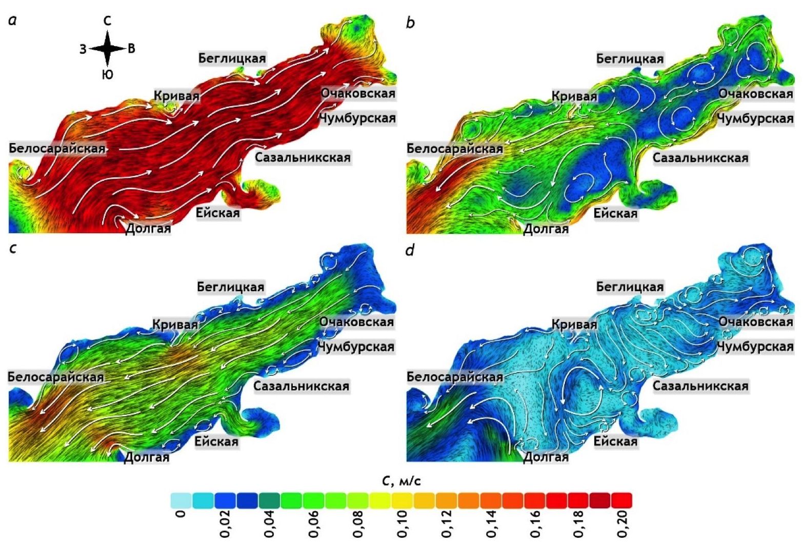 Заметим, что пространственное положение Таганрогского залива, а имен-но вытянутость по линии ЗЮЗ – ВСВ, соответствует направлениям преобладающих ветров над акваторией залива, что способствует развитию сгонно-нагонных явлений, во многом определяющих циркуляцию вод. На рис. 7 в качестве примера представлены схематические карты, отображающие магнитуду и направление придонных течений во время прохождения сильного ЮЗ шторма (а); ослабления ЮЗ шторма (b); развития СВ ветра (c); ослабления СВ ветра (d).