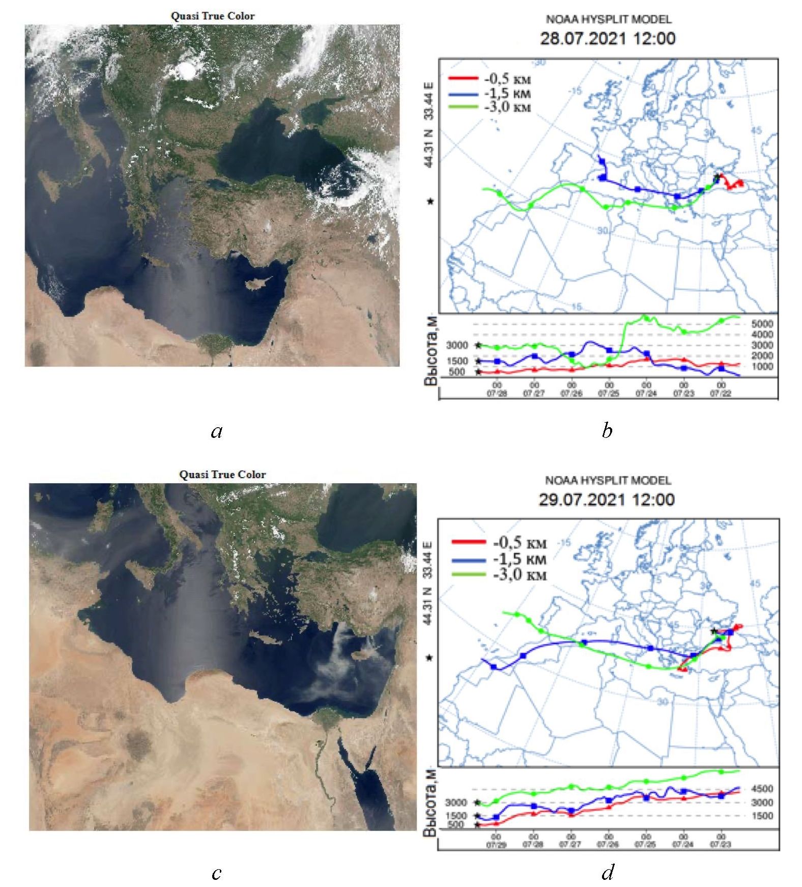 В период с 28 по 29 июля 2021 г. по спутниковым данным над Черноморским регионом наблюдался интенсивный пылевой перенос со стороны Аравийского п-ова и Сахары. Как видно на спутниковых изображениях VIIRS в псевдоцветах, пылевой перенос регистрируется по обеим сторонам от области засветки, а значит, масштаб пылевого события более тысячи квадратных километров. На всех представленных спутниковых снимках также хорошо визуализируется область интенсивных пожаров на побережье Средиземного моря (территория Турции). Интенсивное поглощение, обусловленное присутствием дымового аэрозоля западнее о. Крит, подтверждается высокими значениями АОТ над восточной частью акватории Средиземного моря за 29.07.2021 (рис. 1). Следующим этапом подтверждения или опровержения события пылевого переноса над Черноморским регионом за исследуемый период был анализ обратных траекторий перемещения воздушных потоков по модели HYSPLIT [34] (рис. 1, b, d). Как видно из рис. 1, за все дни на высоте 3 км регистрируется пылевой перенос со стороны пустыни Сахара.