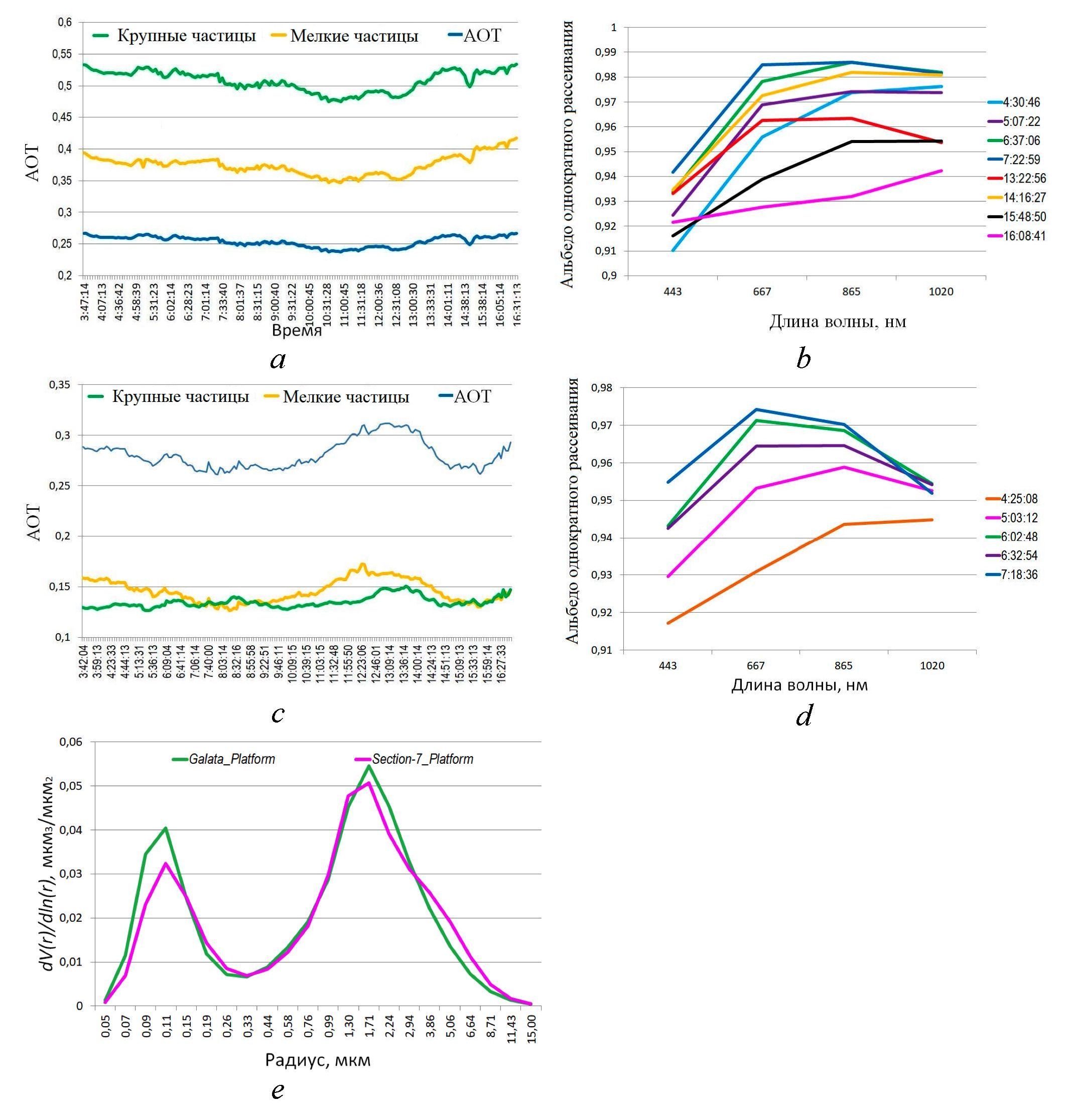 Р и с. 2. На станциях сети AERONET за 28.07.2021: вклад мелкодисперсных (менее 2,5 мкм) и крупнодисперсных частиц (2,5 мкм и более) в общее распределение АОТ на Galata_Platform (а) и Section_7 (с), альбедо однократного рассеивания на Galata_Platform (b) и Section_7 (d), распределение частиц по размерам на двух станциях (e)