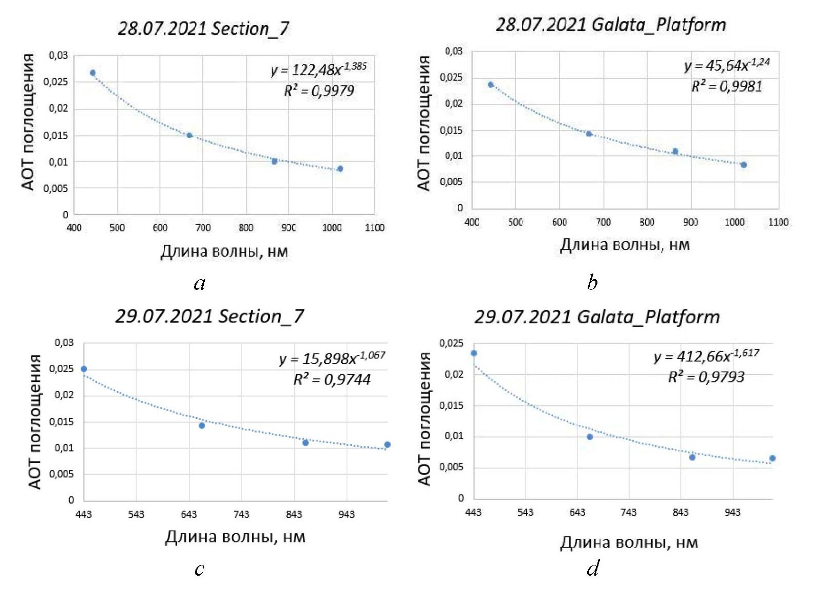 Р и с. 3. Ход степенной функции оптической толщины аэрозольного поглощения за 28.07.2021 на Section_7 (а), Galata_Platform (b) и 29.07.2021 на Section_7 (c), Galata_Platform (d)