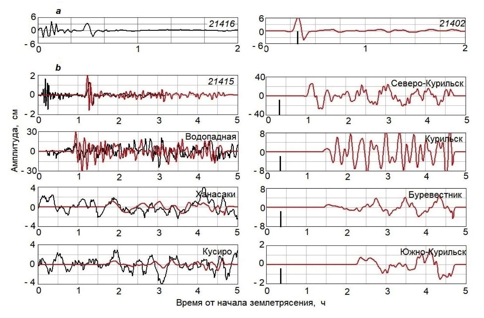 Р и с. 2. Волновые формы симуширского цунами 2006 г.: a – зарегистрированная станцией DART 21414 (слева) и реконструированная на станции DART 21419 (справа); b – зарегистрированные (черная линия) и расчетные (красная линия) по реконструированным данным станции DART 21419. Здесь и далее на каждом графике указан номер станции DART или название населенного пункта, вертикальная черная линия – граница данных, используемых при прогнозе, а также момент выработки прогноза для пунктов на Курильских о-вах