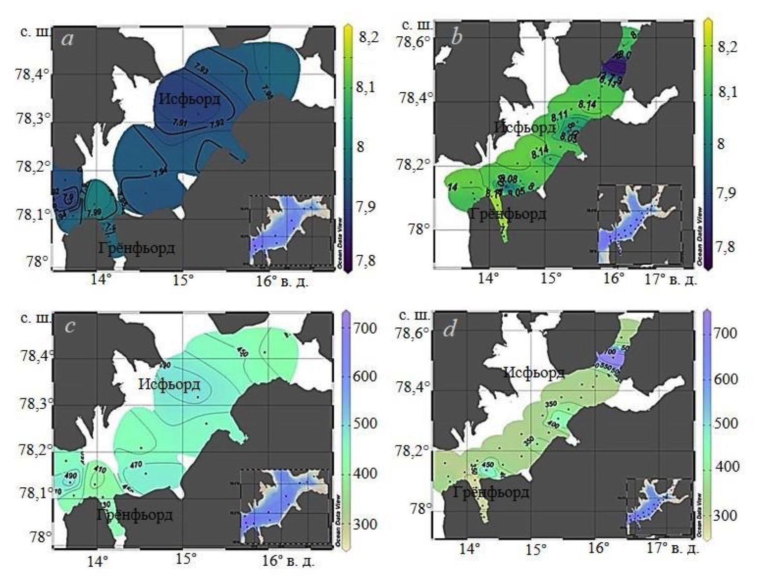 В августе значения рН на акватории Исфьорда находились в пределах 7,97–8,15. При этом значения рСО2 на большей части акватории фьорда составили ~ 350 мкатм, за исключением локальных зон с повышенными значениями 400–450 мкатм. В Грёнфьорде рСО2 изменялось в диапазоне 276–330 мкатм, рН – в диапазоне 8,14–8,20.