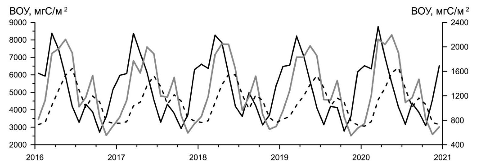 Рис. 1. Временная изменчивость суммарного взвешенного органического углерода в трех слоях: 0–56 м (черная линия), 56–95 м (серая линия) и 95–350 м (штриховая). Левая ось ординат относится к слою 0–56 м, правая – к двум другим слоям. Графики построены по результатам численного моделирования