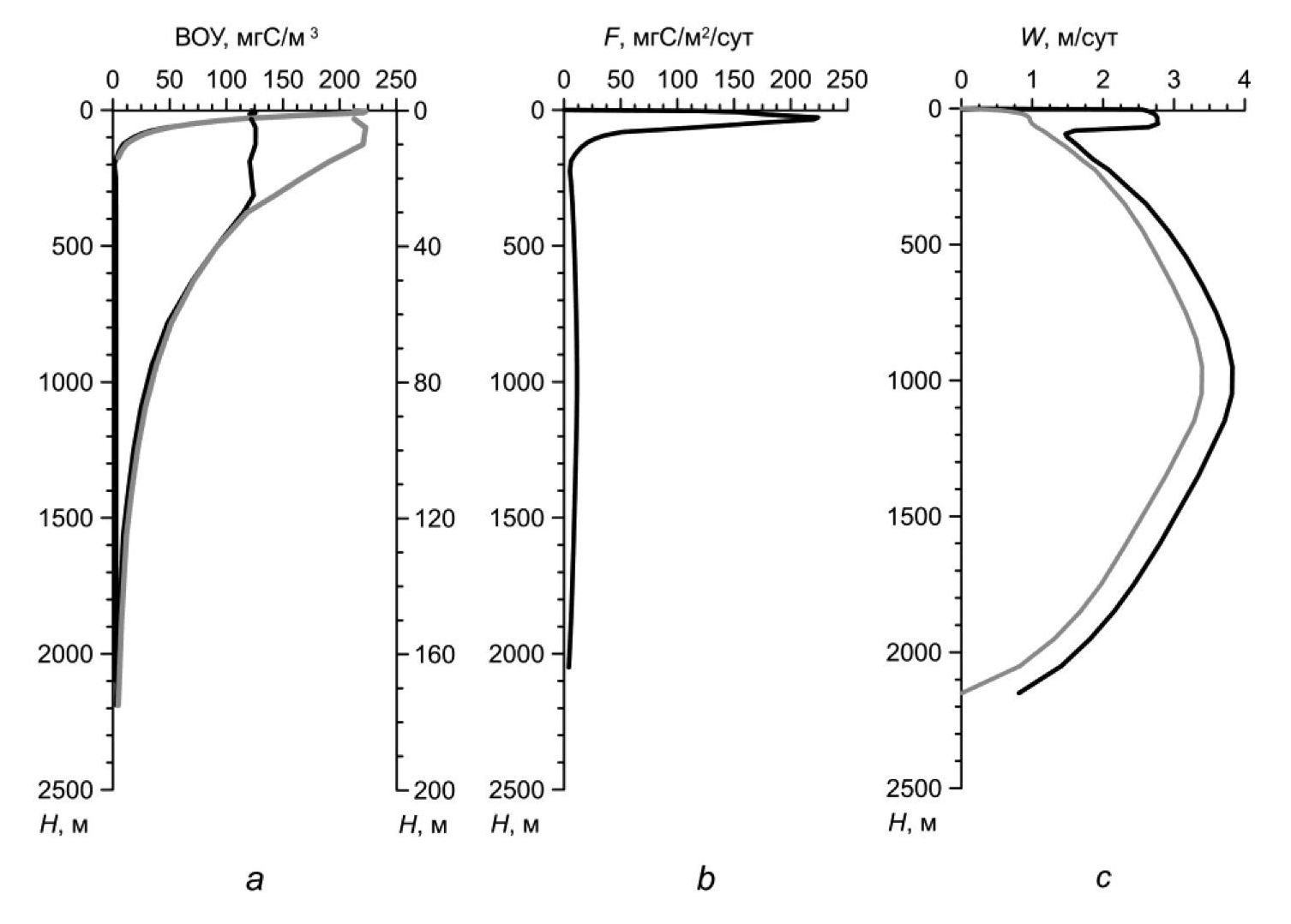 Рис. 2. Вертикальные профили ВОУ для всей толщи воды (левая ось ординат) и верхнего 200-метрового слоя (правая ось), осредненные по всему бассейну (черная линия) и шельфу (серая линия) (a); профиль вертикального потока ВОУ (b); профили средней вертикальной скорости жидкости, направленной ко дну (серая линия) и скорости жидкости плюс скорость седиментации (черная линия) (c). Все профили построены по результатам численного моделирования