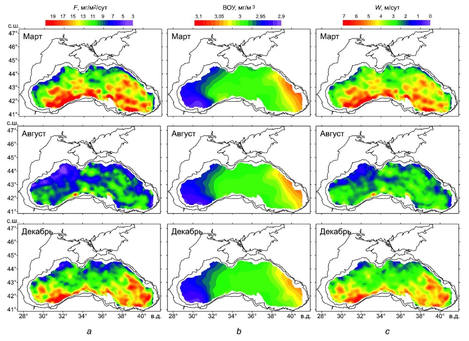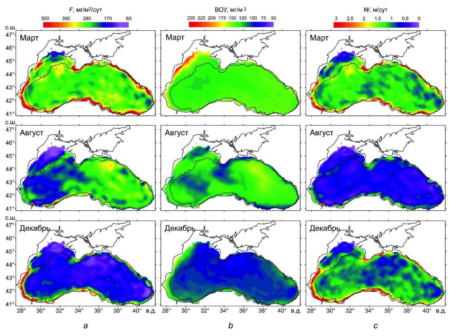 Приведенные на рис. 3 среднемесячные карты распределения потоков ВОУ, его концентрации и вертикальной скорости на горизонте 30 м получены осреднением за 5 лет для трех месяцев – марта, августа и декабря. В марте концентрация ВОУ довольно высока на всей акватории Черного моря (~ 150 мг/м3), соответственно вертикальные потоки ВОУ также имеют высокие значения (~ 300 мг/м2/сут) по всей акватории. В августе концентрация ВОУ заметно ниже, чем в марте, также ниже и значения вертикальных потоков, особенно в западной части моря. В декабре наблюдаются самые низкие значения концентрации и вертикальных потоков ВОУ. Таким образом, на горизонте 30 м значения вертикальных потоков ВОУ хорошо коррелируют с его концентрацией. Это подтверждает сделанный ранее вывод, что в приповерхностном слое Черного моря вертикальные потоки ВОУ определяются главным образом его концентрацией. Что касается вертикальной скорости (рис 3, c), то ее наименьшие значения наблюдаются в августе, тогда как наименьшие значения потоков отмечаются в декабре (рис 3, a). В то же время пространственная изменчивость вертикальной скорости существенно влияет на пространственное распределение потоков. Так, в марте наблюдаются повышенные значения вертикальной скорости на периферии бассейна, в этих же местах отмечаются повышенные значения потоков ВОУ. В декабре высокие вертикальные скорости и повышенные значения потоков ВОУ наблюдаются вдоль глубоководной части западного берега и южного берега Черного моря.