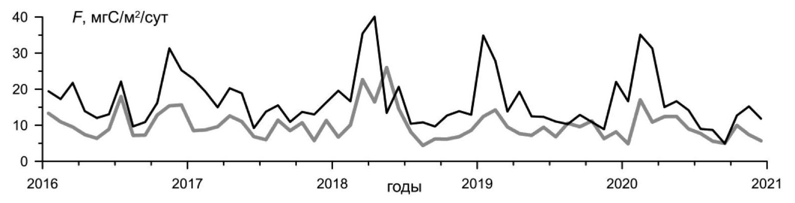 Fig. 5. Graphs of time variability of POC fluxes in the model computational grid node (coordinates are 42.063° N and 32.362° E) at the 250 m (gray line) and 1200 m (black line) horizons