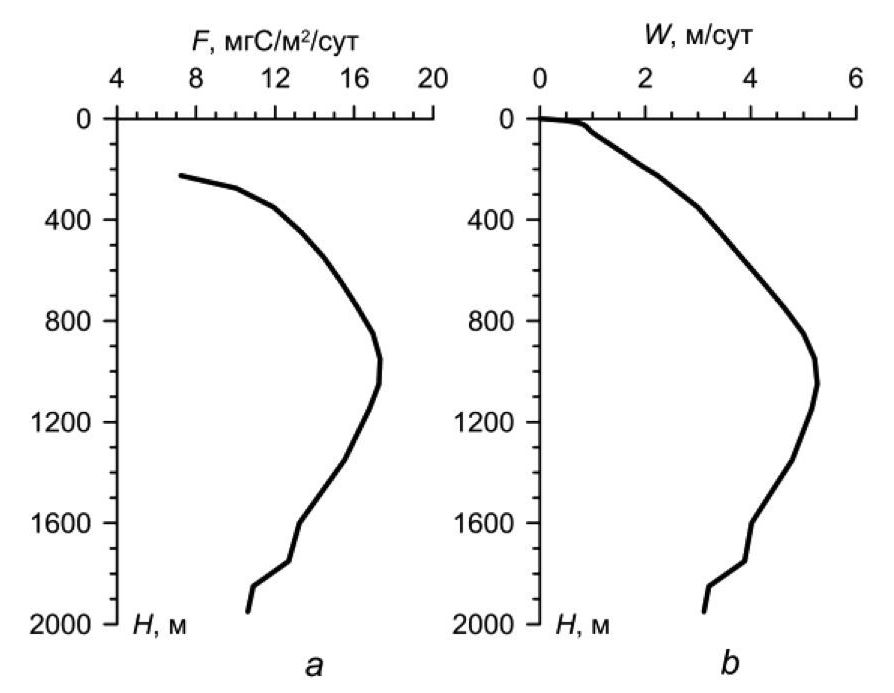 Fig. 6. Profiles of POC flux (a) and vertical velocity (b) for the model computational grid node (coordinates are 42.063° N and 32.362° E)