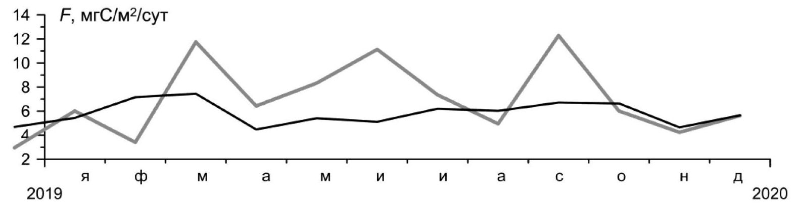 Представленные на рис. 7 вертикальные потоки за 2019 г. получены по результатам моделирования. Здесь на горизонте 150 м в целом они больше (за исключением нескольких месяцев), чем на горизонте 1700 м. Средние значения потоков составили 6,95 мг/м2/сут на глубине 150 м и 5,8 мг/м2/сут на глубине 1700 м. Таким образом, среднее значение вертикального потока ВОУ на глубинном горизонте, полученное по результатам моделирования, близко к измеренному, а на горизонте 150 м результаты моделирования превышают измеренные значения.