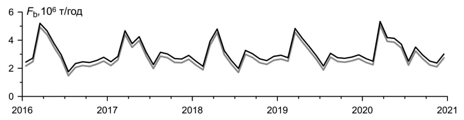 На основе полученных полей можно оценить, сколько взвешенного углерода оседает на дно и тем самым выводится из карбонатной системы Черного моря. Так как вертикальная скорость жидкости на дне равна нулю в силу условия непротекания, вертикальный поток взвешенного углерода в каждой точке морского дна будет равен , где – концентрация взвешенного углерода в придонной ячейке. На рис. 8 приведены графики изменения суммарного потока взвешенного углерода на дно Черного моря для всей акватории и шельфовой зоны. Значения потоков для шельфа и всего моря практически совпадают. Это говорит о том, что в основном оседание взвешенного углерода на дно на шельфе происходит за счет того, что на значительной части северо-западного шельфа глубина меньше 50 м, а на этих глубинах концентрация ВОУ на два порядка превосходит соответствующие значения в глубинных слоях моря. Максимум оседания на дно приходится примерно на март, что соответствует максимуму суммарного содержания ВОУ в слое фотосинтеза (рис. 1).
