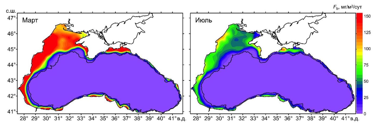 На рис. 9 показано распределение потоков оседания ВОУ на дно Черного моря для марта (максимумы на графиках рис. 8) и для июля (минимумы). Видно, что оседание на дно в районе шельфа существенно превосходит оседание в глубоководной части моря. Среднее значение потери углерода вследствие оседания на дно равно (по графику на рис. 8) 3,1·106 т/год (2,83·106 т/год – на шельфе). В работе [11] поступление в Черное море ВОУ со стоком рек оценивалось в 2,6·106 т/год, что оказалось близким к значению оседания на дно, полученному по результатам моделирования.