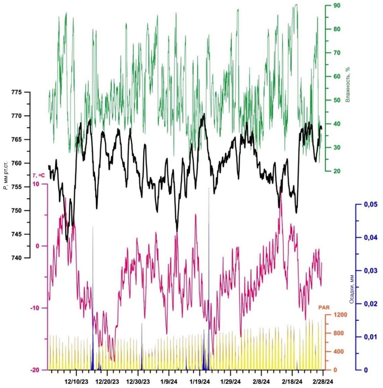 Рис. 7. Результаты метеорологического мониторинга на МЭС «м. Шульца» за декабрь 2023 г. – февраль 2024 г. Желтым цветом показана фотосинтетически активная радиация, синим – количество осадков, красным – температура, черным – атмосферное давление, зеленым – влажность