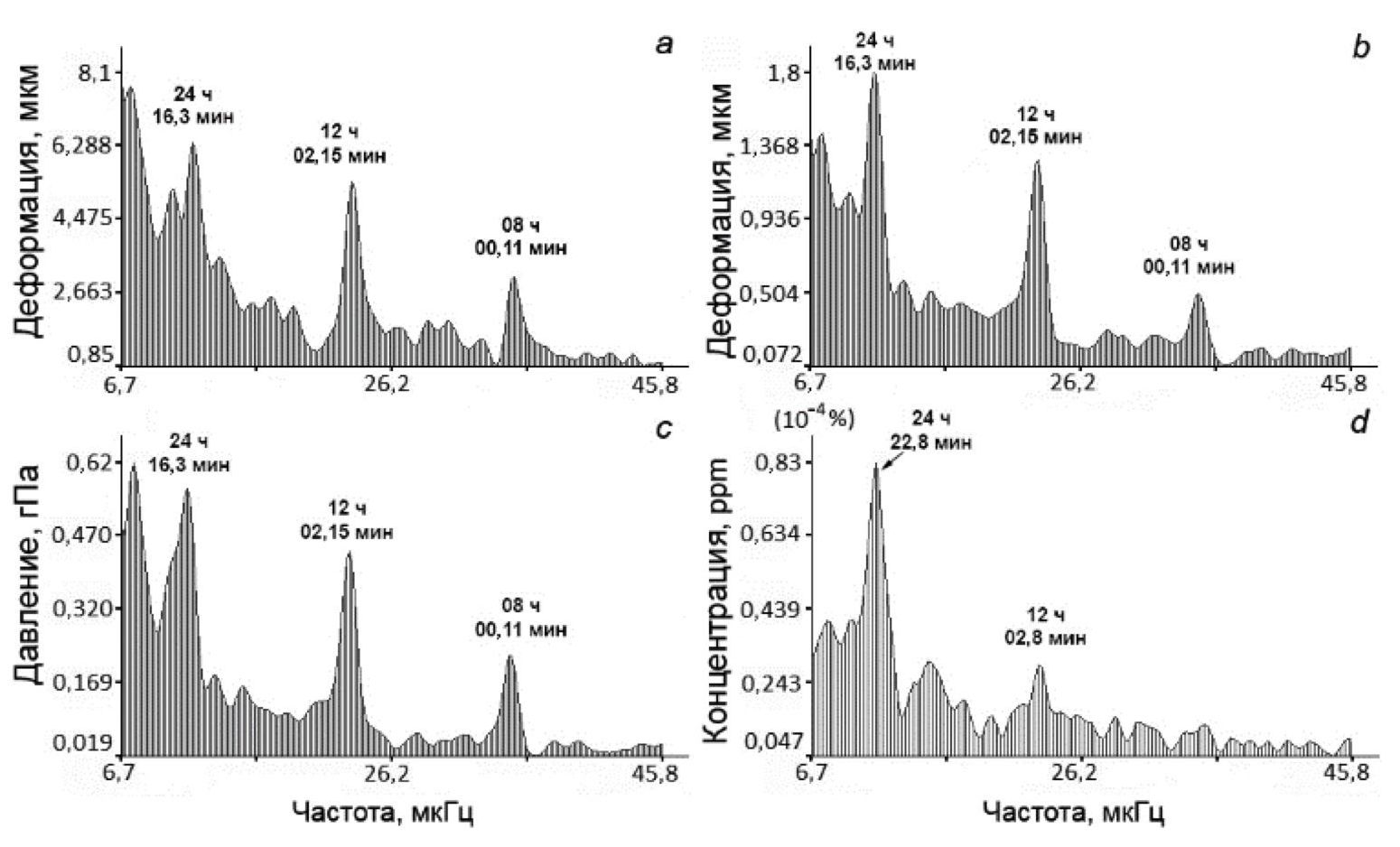 Данные деформационного и газового мониторинга за 1–25 декабря 2023 г. были подвергнуты спектральной обработке периодограммным методом с числом осреднений 3. Результаты обработки данных, приведенных на рис. 8 и 13, отображены на рис. 14.
