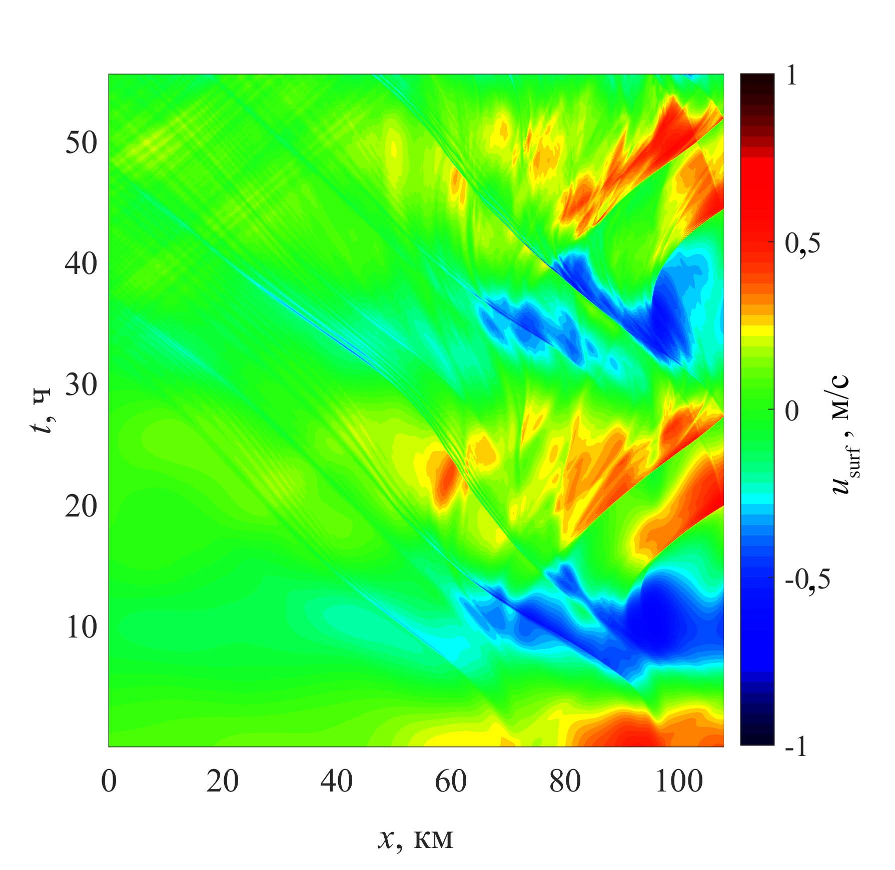 Подробное описание модели, а также волновой динамики вдоль отдельных разрезов дано в наших работах [16, 17]. Здесь обсудим дальнейшую обработку полученных результатов расчетов: выделение скорости на определенном горизонте, определение вероятностей превышения уровня и построение карт пороговых значений.