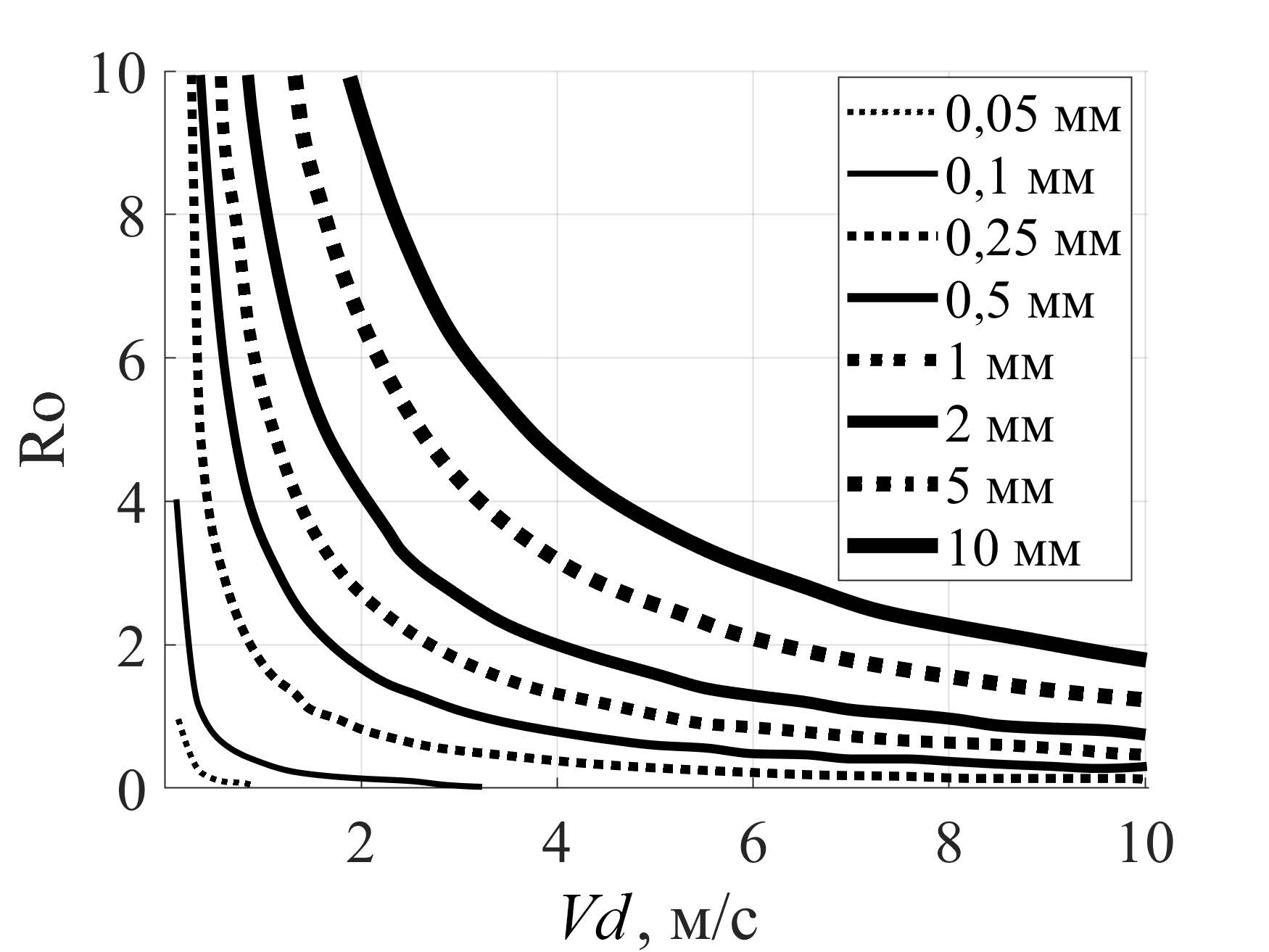 где β – отношение вихревой вязкости к вихревой диффузии (приблизительно равное единице); k – постоянная Кармана (равная 0,4). На рис. 3 приведена номограмма, позволяющая определить характер движения наносного материала: при коэффициенте параметра Ro ≥ 7 происходит инициирование движения наносов волновым потоком и частицы начинают двигаться в виде качения; увеличение скорости потока при 7,5 ≥ Ro ≥ 2,5 приводит к движению влекомых наносов; при 2,5 ≥ Ro ≥ 1,2 происходит сальтация частиц наносов; движение взвешенных наносов возникает при 1,2 ≥ Ro ≥ 0,8; интенсивное движение донных осадков, приводящее к значительным деформациям дна, происходит при Ro ≤ 0,8 [22].