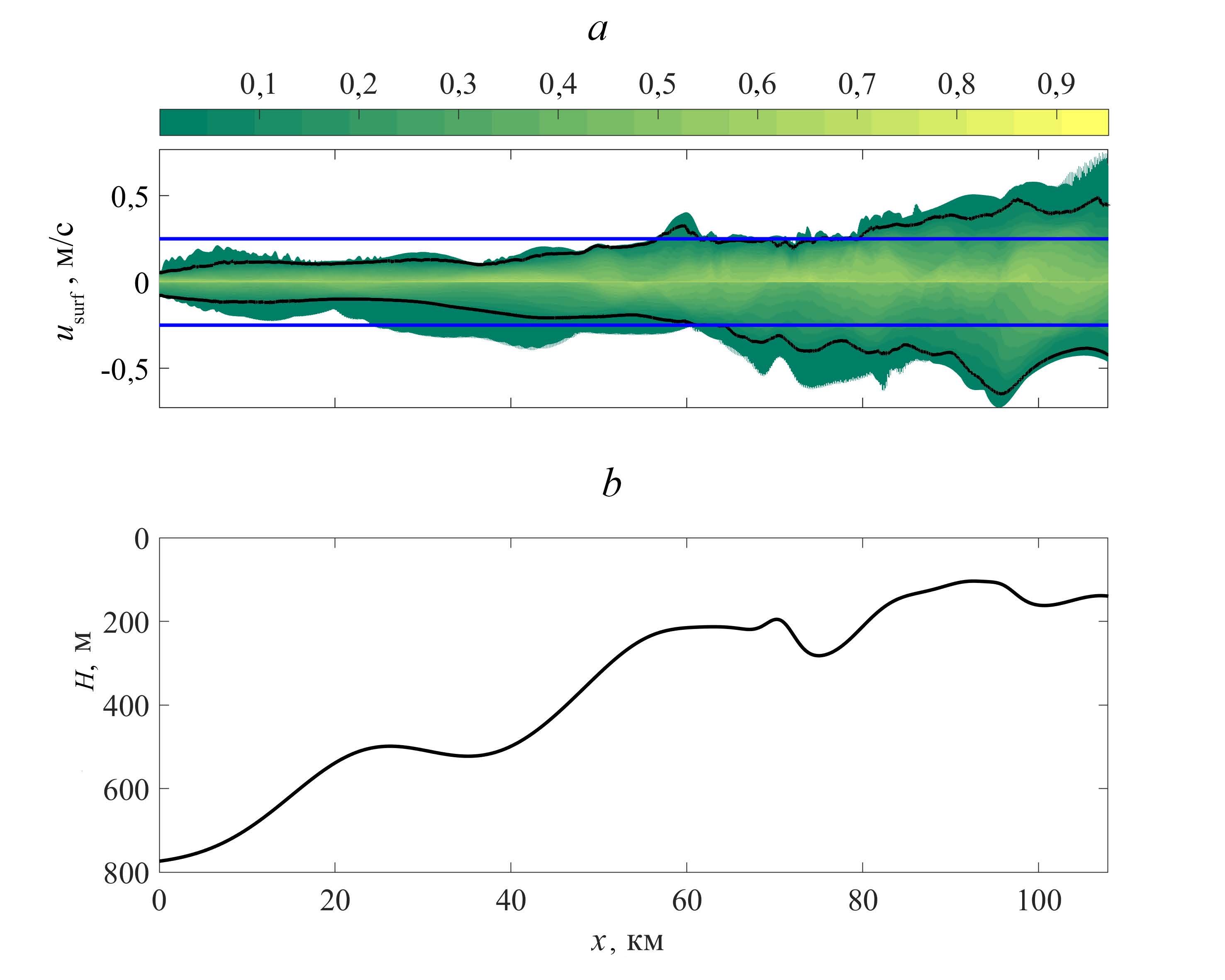 Рис. 4. Диаграмма вероятности превышения уровня приповерхностной (выделенной на глубине 15 м) скорости на разрезе 16 с учетом знака (направления): синяя линия – срез по значению 0,25 м/с; черная кривая – срез по вероятности 0,05 (а); нижний график – батиметрия дна (b)