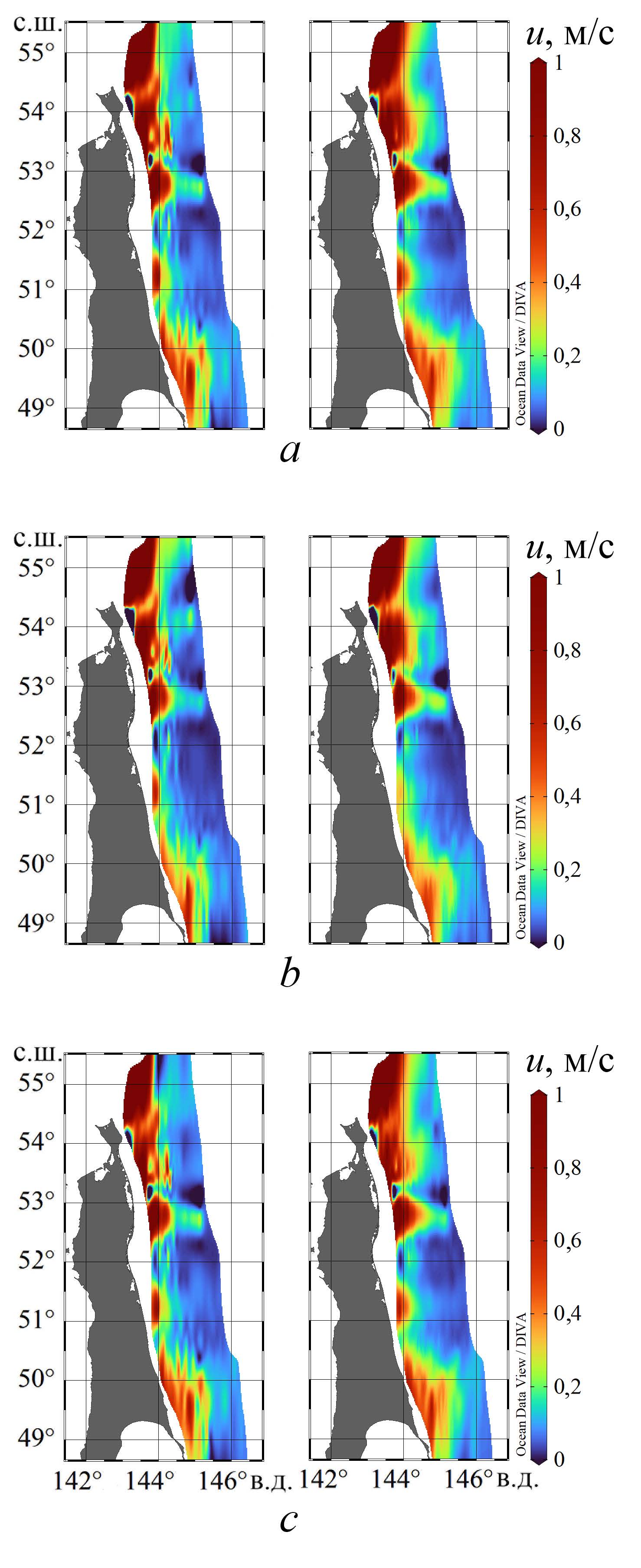 Рис. 7. Карты распределения значений придонной (15 м над уровнем дна, слева) и приповерхностной (15 м от поверхности, справа) скоростей по абсолютному значению (а), в направлении к берегу (b) и от берега (c), которые будут превышены с вероятностью 0,05