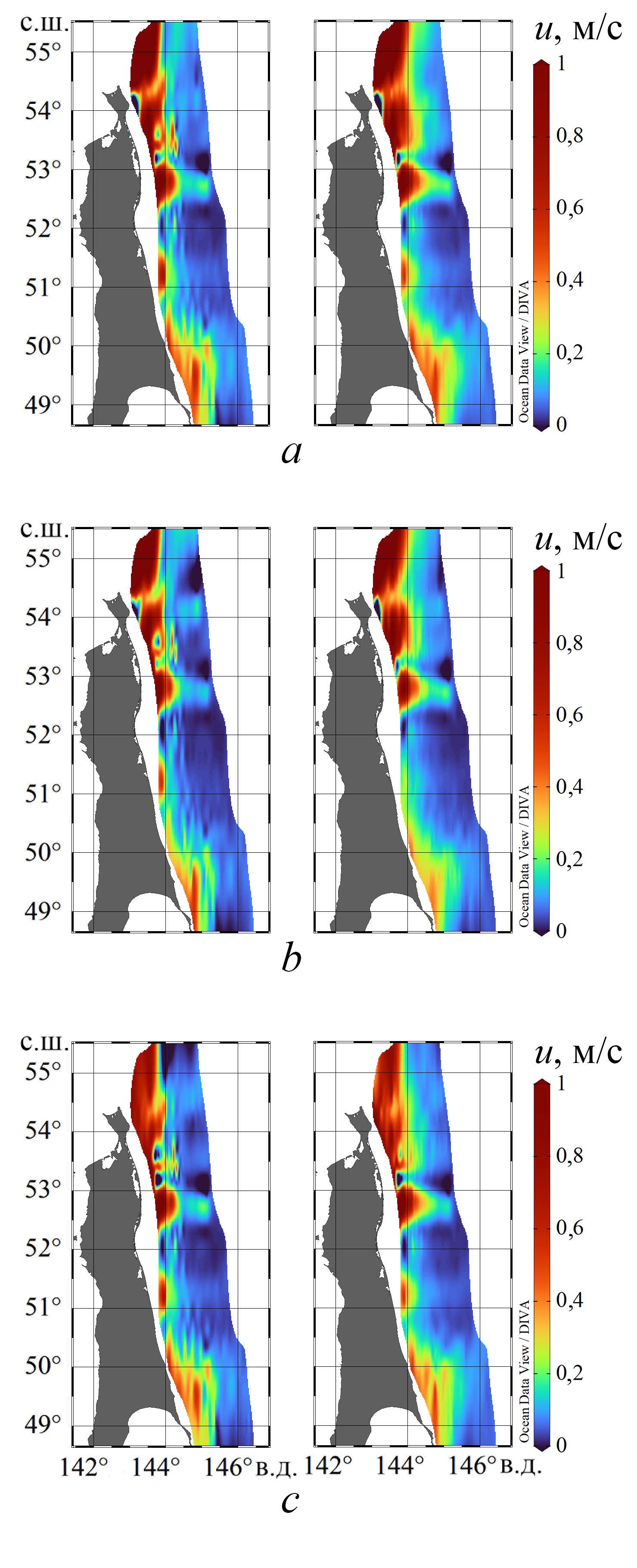 Conclusions. It is shown that the studied shear flows are nonlinear and characterized by significant asymmetry in distribution both in direction (from coast/to coast) and over depth (in the near-bottom and near-surface layers). In the areas where the sea depth is 700–800 m, there is a clearly defined zone where the absolute values of near-surface velocities are several times higher than those of the near-bottom ones. The main zones including the local maxima of velocity field are located in the north – from Cape Elizabeth to Piltun Bay, with one more from Cape Bellingshausen to Cape Terpeniya.