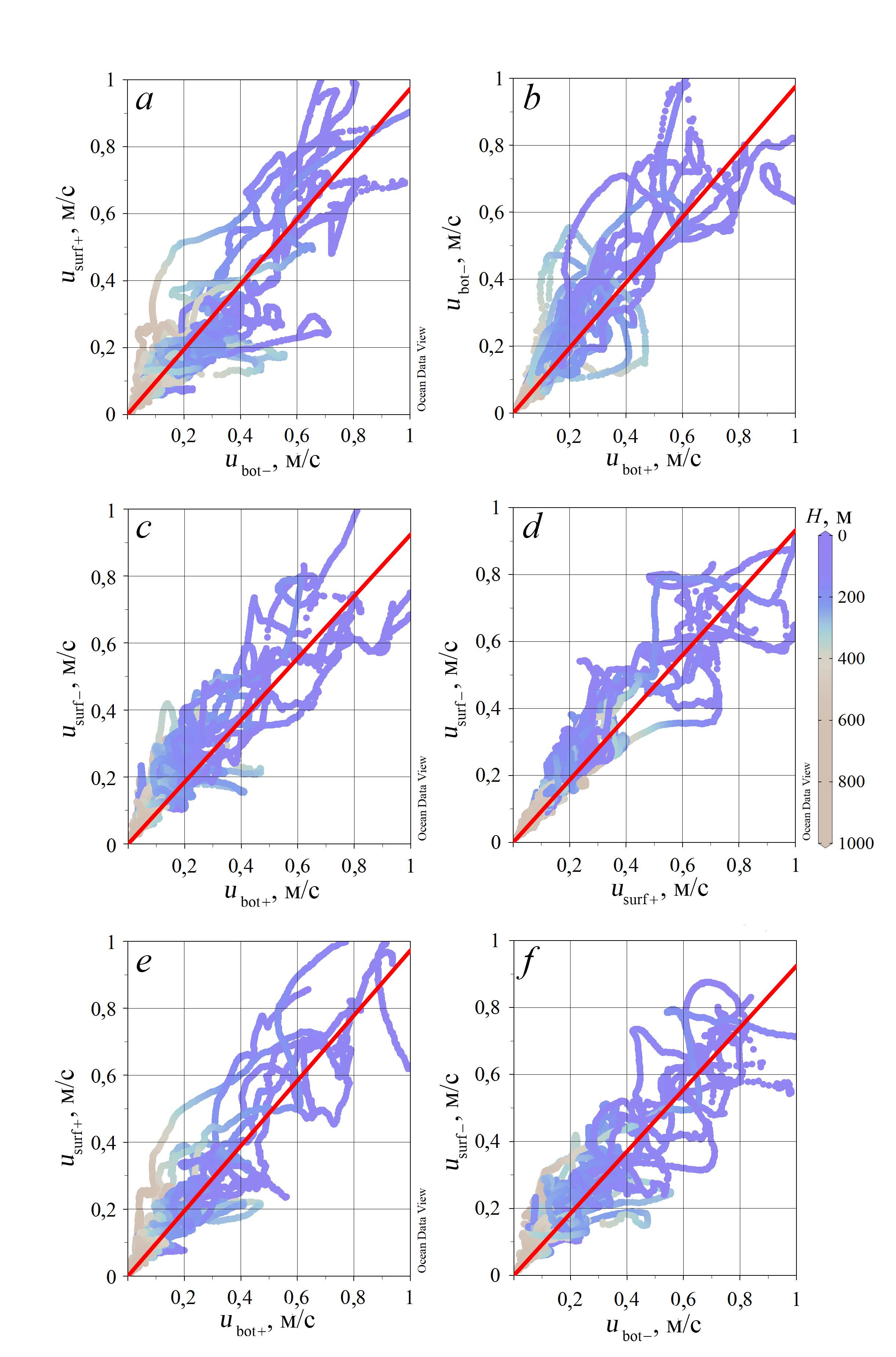Показано, что поле горизонтальной скорости существенно нелинейно: видна асимметрия как по направлению (от берега / к берегу), так и по глубине (в придонном и приповерхностном слоях). Для демонстрации этого вывода также построены диаграммы рассеяния различных комбинаций придонных и приповерхностных скоростей по абсолютному значению и с учетом направления. Максимальный разброс точек на всех диаграммах наблюдается на глубинах моря до ~ 500 м, а значения придонных и приповерхностных скоростей больше 0,5 м/c прослеживаются на глубинах меньше 300 м. Учет направления скорости и глубины замера (придонная/приповерхностная) приводит к увеличению разброса точек и ширины сечения облака точек (особенно при значениях больше 0,3 м/c), что, по всей видимости, связано со сложной нелинейной структурой поля горизонтальной скорости.