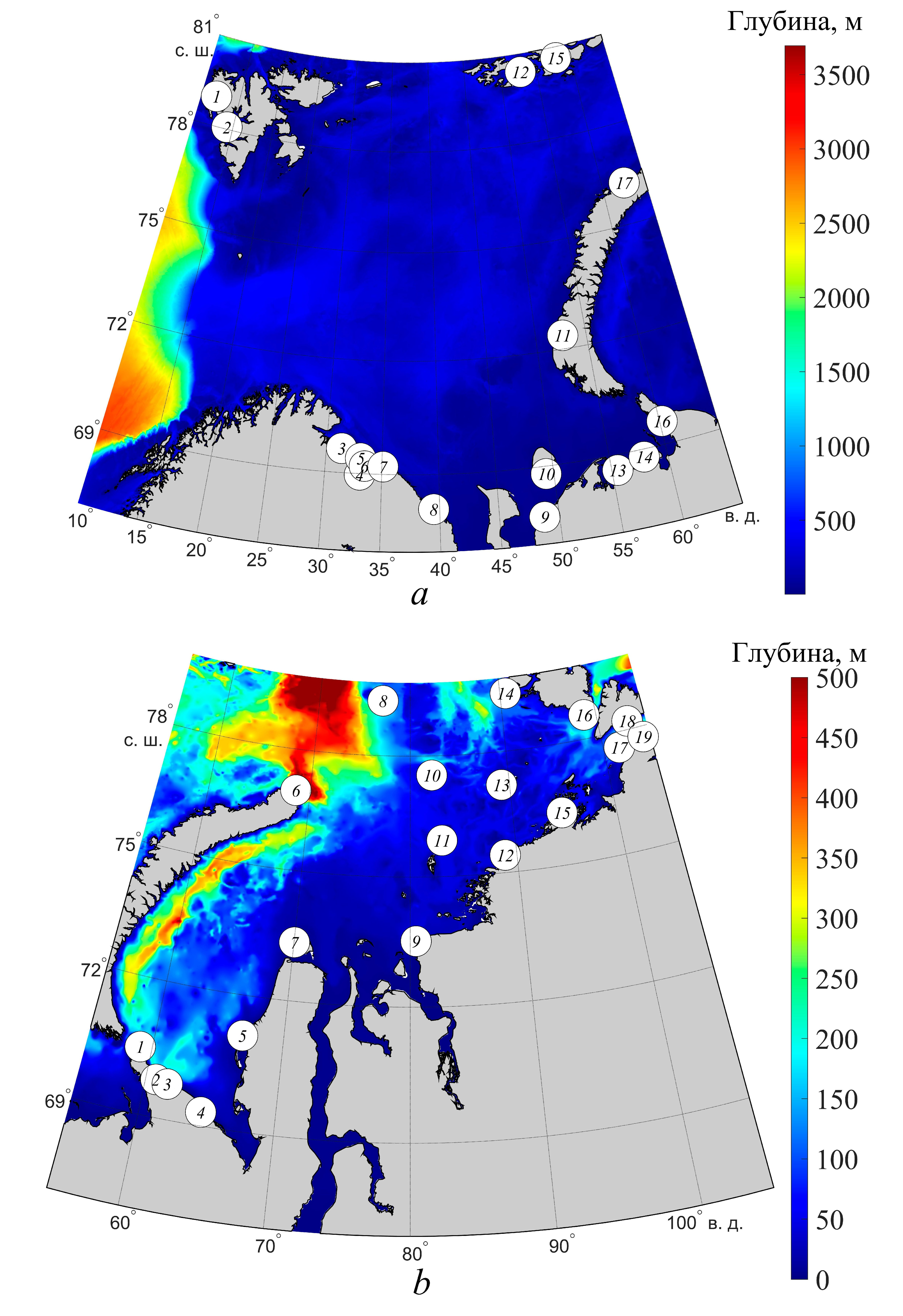 Рис.1. Расположение пунктов (станций) наблюдений уровня Баренцева (а) и Карского (b) морей (названия пунктов см. в таблице)