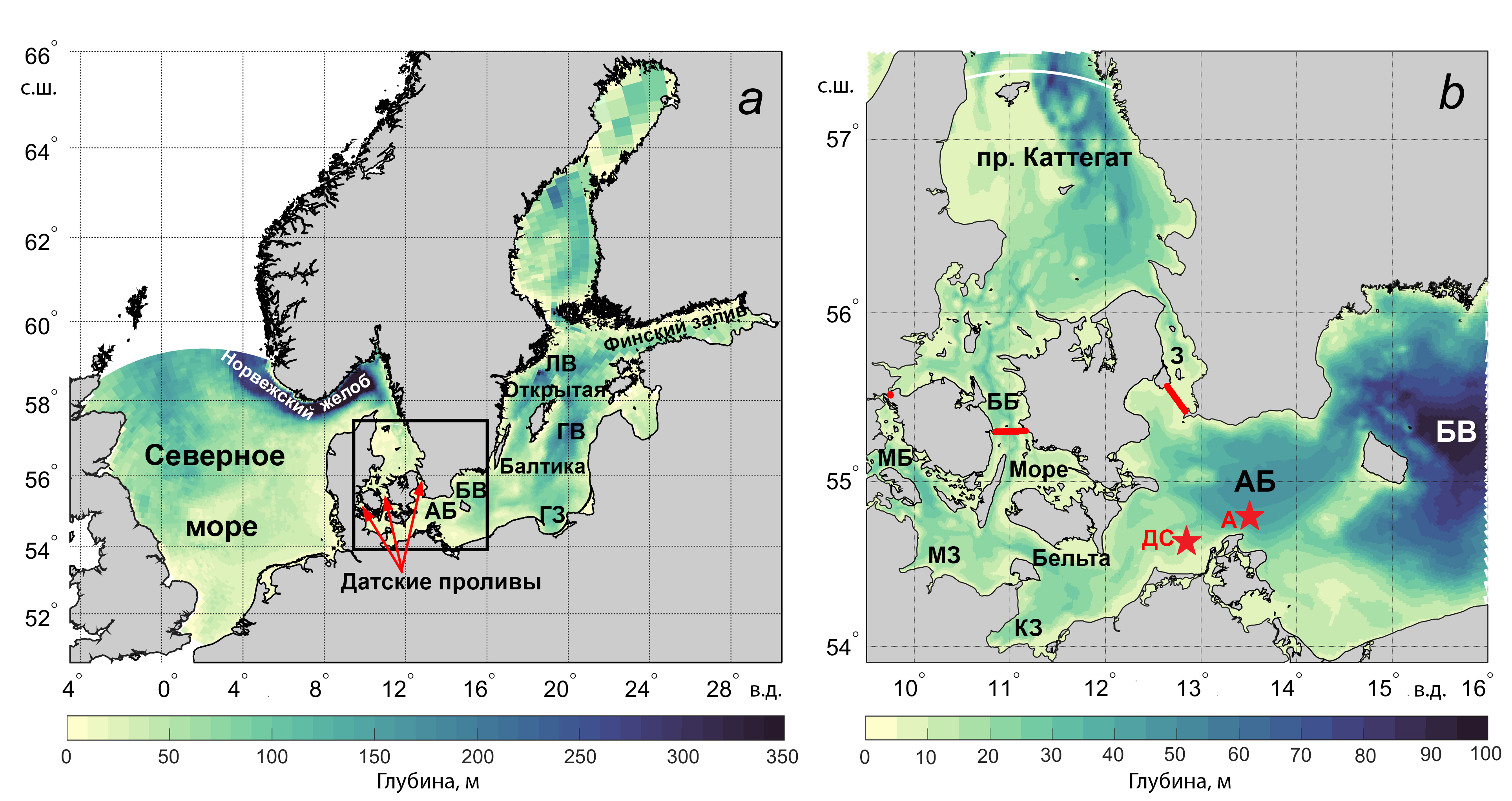 Рис.1. Батиметрия Северного и Балтийского морей (черным квадратом обозначен район Юго-Западной Балтики и Каттегата) (а), укрупненное изображение выделенной области (b). Обозначения: звездочки – местоположение автоматических станций Дарсс Силл (ДС) и Аркона (А); АБ – Арконский бассейн, БВ – Борнхольмская впадина, ГВ – Готландская впадина, ЛВ – Ландсортская впадина, МБ – пролив Малый Бельт, ББ – пролив Большой Бельт; З – пролив Зунд, СК – Скагеррак, МЗ – Мекленбургский залив, КЗ – Кильский залив, ГЗ – Гданьский залив