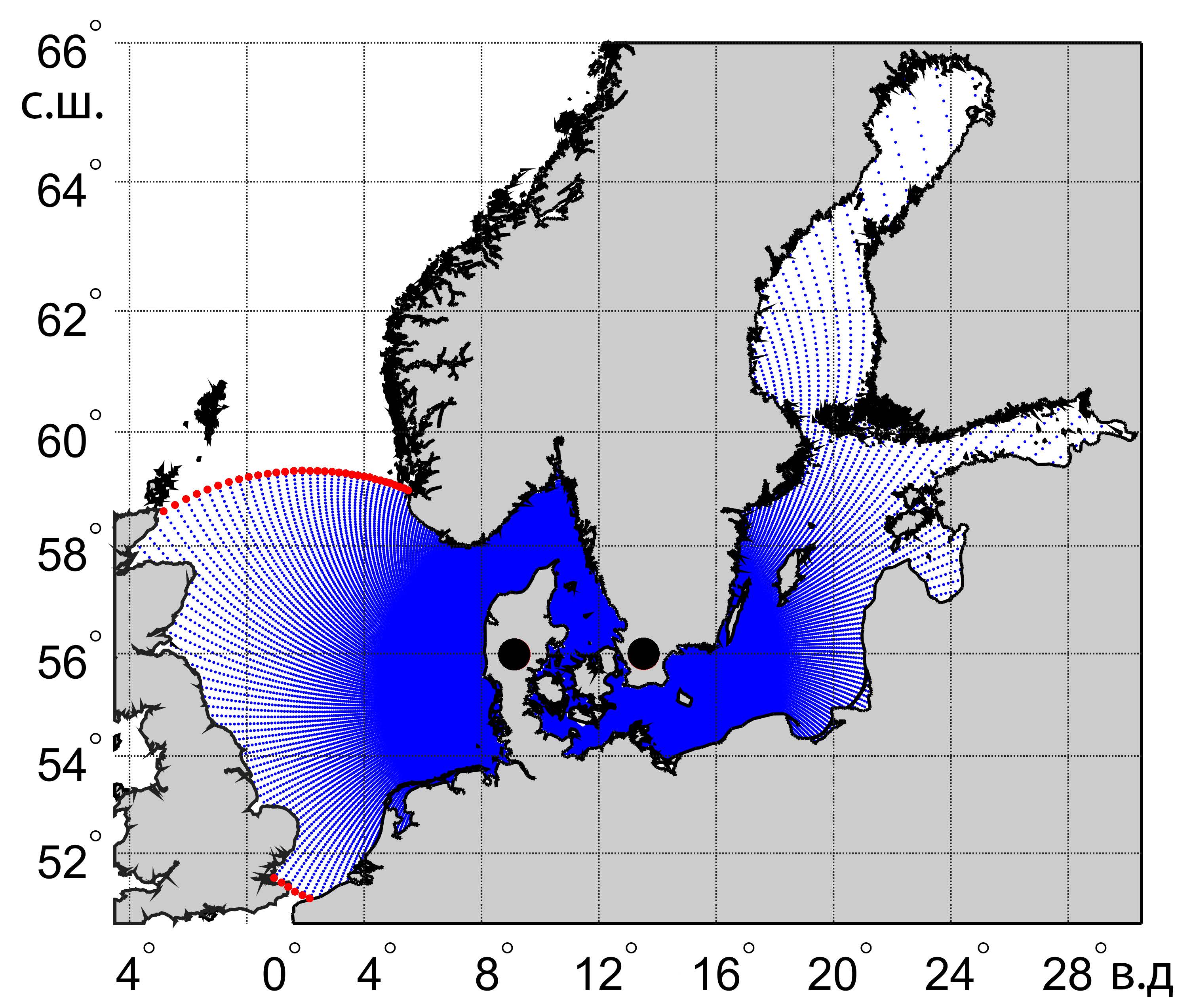 В модели используется сферическая сетка с двумя полюсами, один из которых расположен на п-ове Юкатан (Дания), а другой – на самом юге Швеции (рис. 2). Пространственное разрешение узлов сеточной области в районе Датских проливов составляет около 300–700 м и пропорционально увеличивается до 6–12 км при удалении от проливов в сторону окраин двух морей.
