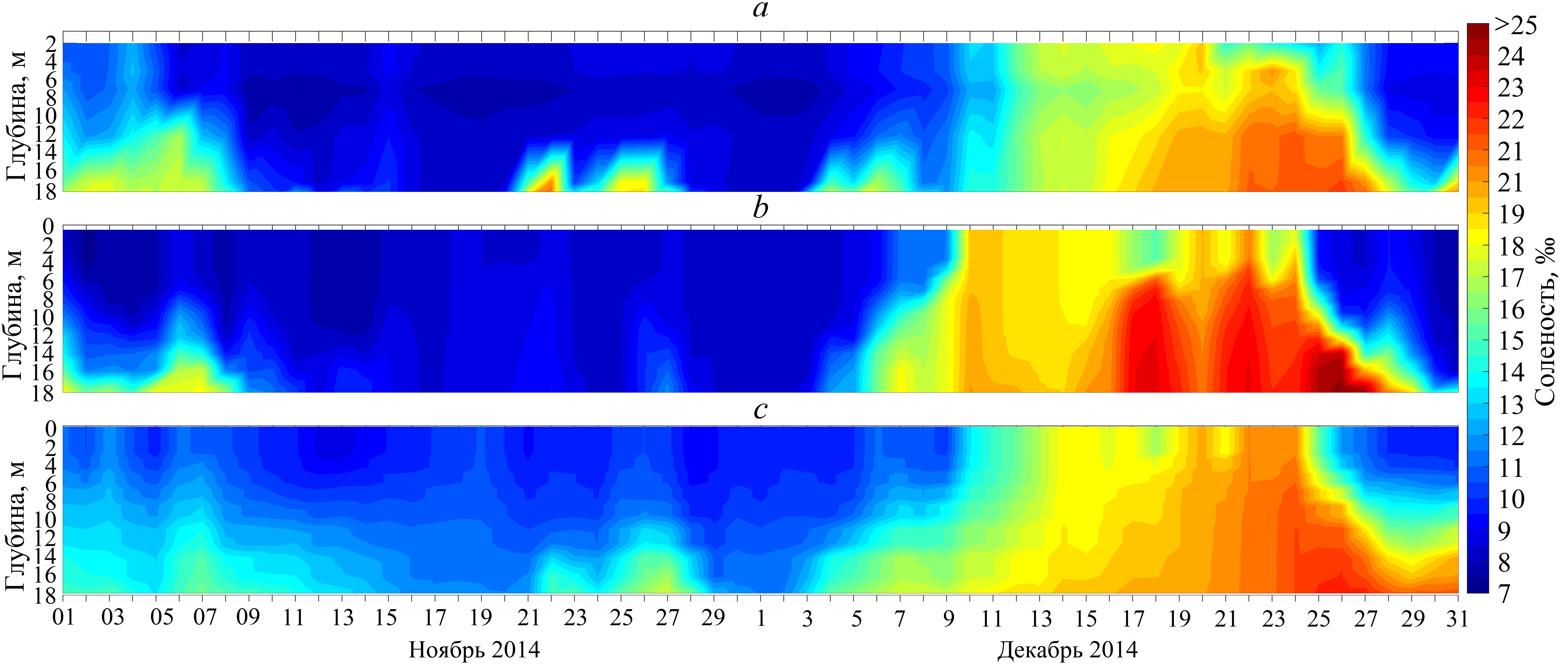 Рис.4. Соленость воды в районе станции Аркона по данным измерений (а), реанализа BSPAF (b) и модели INMOM (с) за 1 ноября – 31 декабря 2014 г.