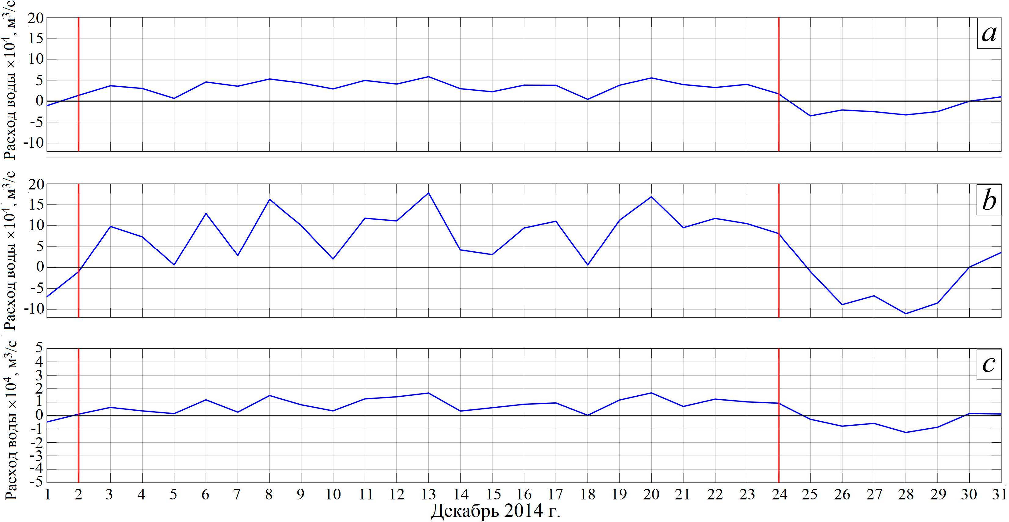 - Моделирование с помощью модели INMOM океанологических условий во время ББЗ 2014 г. свидетельствует, что основной период ББЗ начался 2–3 декабря 2014 г. и продолжался до 24 декабря 2014 г. В этот период в Датских проливах отмечаются однонаправленные и уменьшающиеся с глубиной в 1,5–2 раза по модулю скорости потоки каттегатских вод в Балтику с максимальными скоростями, достигающими в Зунде и Большом Бельте 1,2 м/с, а в Малом Бельте – всего 0,4 м/с. Характер движения однонаправленных потоков каттегатских вод в проливах не монотонный, а флуктуационный. Периоды между флуктуациями течений варьируют от 2 до 4 сут, а сами скорости течений изменяются при этом на 20–60 см/с.