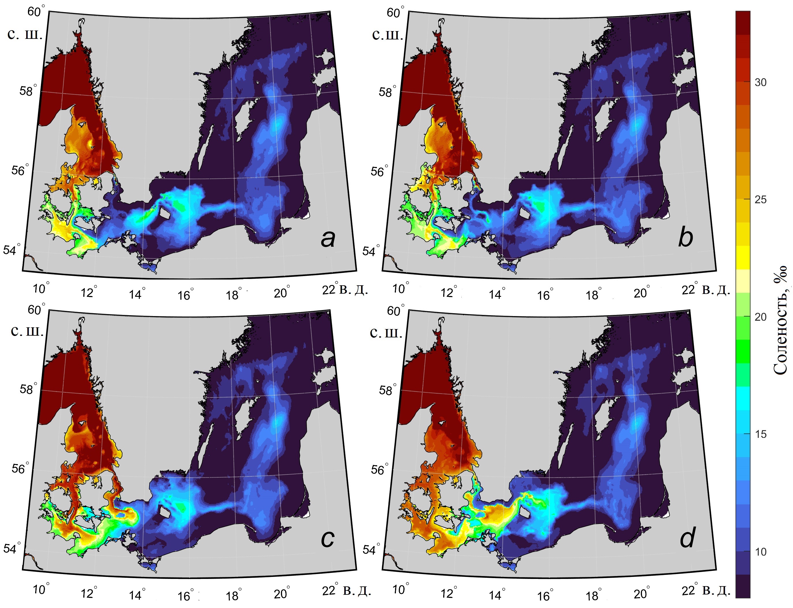 В период после большого затока в конце декабря 2014 г. трансформированными североморскими водами оказывается заполнена почти вся Арконская впадина, частично Бормхольмская впадина, Кильский, Мекленбургский заливы и море Бельта (рис. 7, d). Соленость вод в Зунде и Большом Бельте заметно снижается.