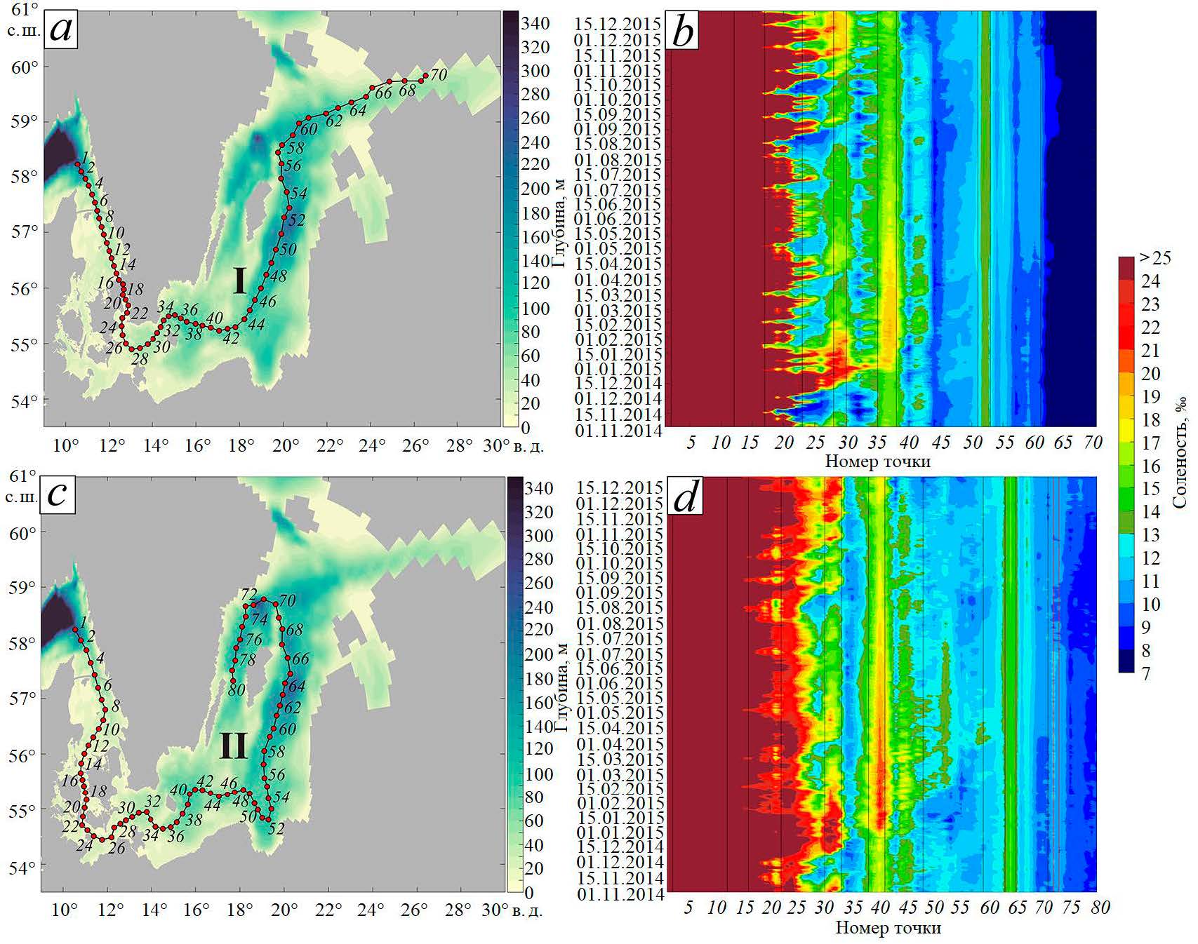 Результаты, представленные на рис. 8, d, показывают, что в середине февраля 2015 г. трансформированные воды ББЗ поступают в Гданьский залив, имея соленость у дна 12–13 ‰. Затем они распространяются на север и в начале апреля 2015 г. приходят в Готландскую впадину (рис. 8, b, d). Дальнейшее повышение солености в придонном слое на разрезе I отмечается до точки 64, свидетельствуя, что в 2015 г. трансформированные воды ББЗ не поступили в Финский залив. На разрезе II повышение солености прослеживается до 71-й точки. Эти результаты демонстрируют, что трансформированные воды ББЗ поступают в западную часть Готландского бассейна.