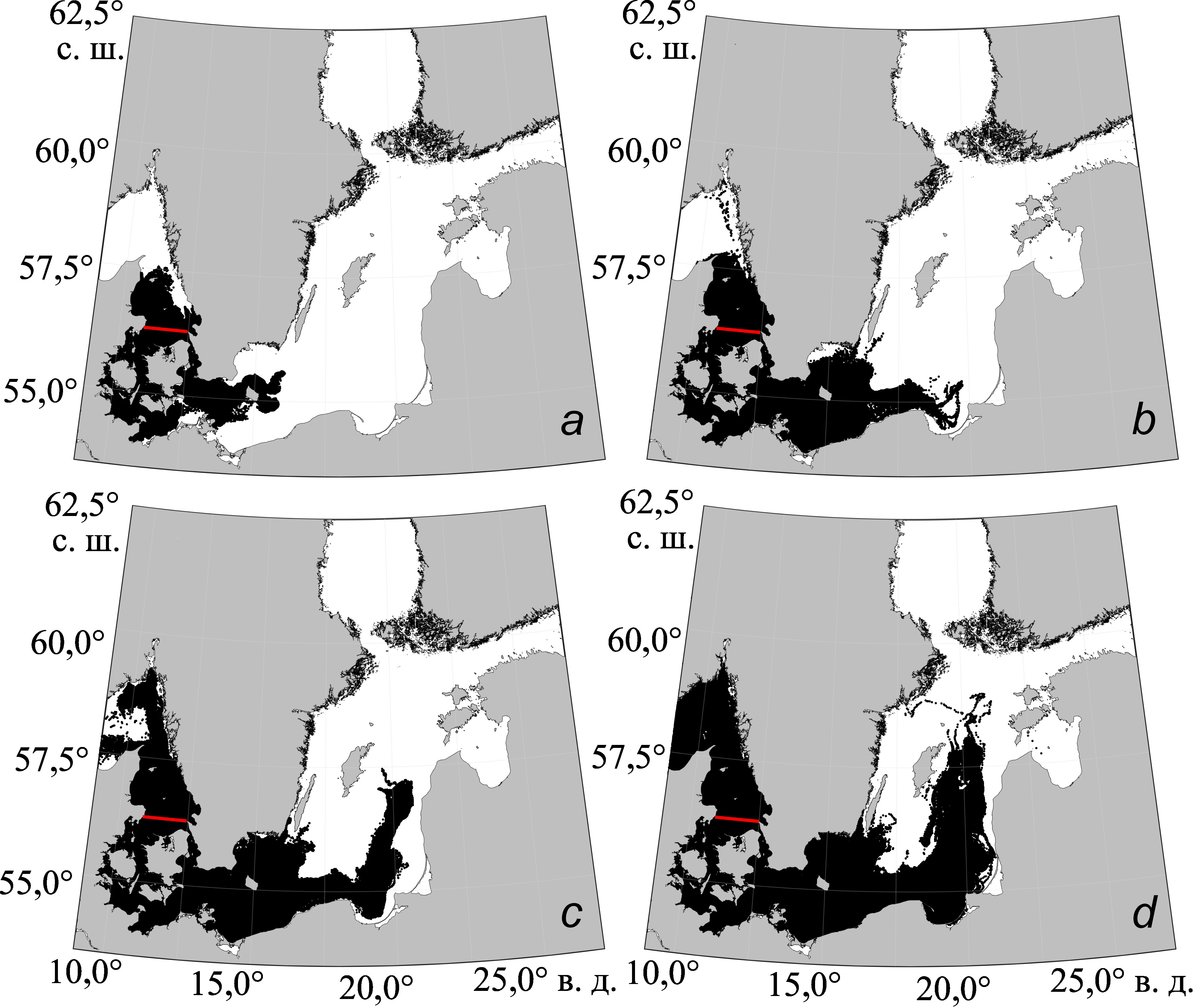 На рис. 9 показаны полученные с помощью лагранжева моделирования траектории движения маркеров, размещавшихся в ноябре – декабре 2014 г. на юге Каттегата. Можно видеть, что к концу декабря 2014 г. бо́льшая часть маркеров проходит Датские проливы, Арконский бассейн и начинает поступать в Борнхольмский бассейн (рис. 9, а), что хорошо согласуется с результатами, полученными другим методом и представленными на рис. 8. Значительная часть маркеров движется от места их размещения на север пролива Каттегат и проникает в проливе Скагеррак (рис. 9, а). К концу марта 2015 г. маркеры почти полностью заполняют Арконский и Борнхольмский бассейны и оттуда широким потоком перемещаются на восток к Гданьскому заливу, где они разделяются на два потока, один из которых, более широкий, активно заполняет Гданьский залив, а другой, более узкий, распространяется севернее Гданьского залива и перемещается в восточную часть Готландского бассейна (рис. 9, b). Еще один узкий поток распространяется из Борнхольмского бассейна на северо-северо-восток (рис. 9, b). К концу июля 2015 г. маркеры, перемещаясь широким потоком, в большом количестве проникают в восточную часть Готландского бассейна и Готландскую впадину (рис. 9, с). В конце декабря 2015 г. они распространяются на север открытой Балтики и, двигаясь по циклонической траектории, попадают в Ландсортскую впадину (рис. 9, d).