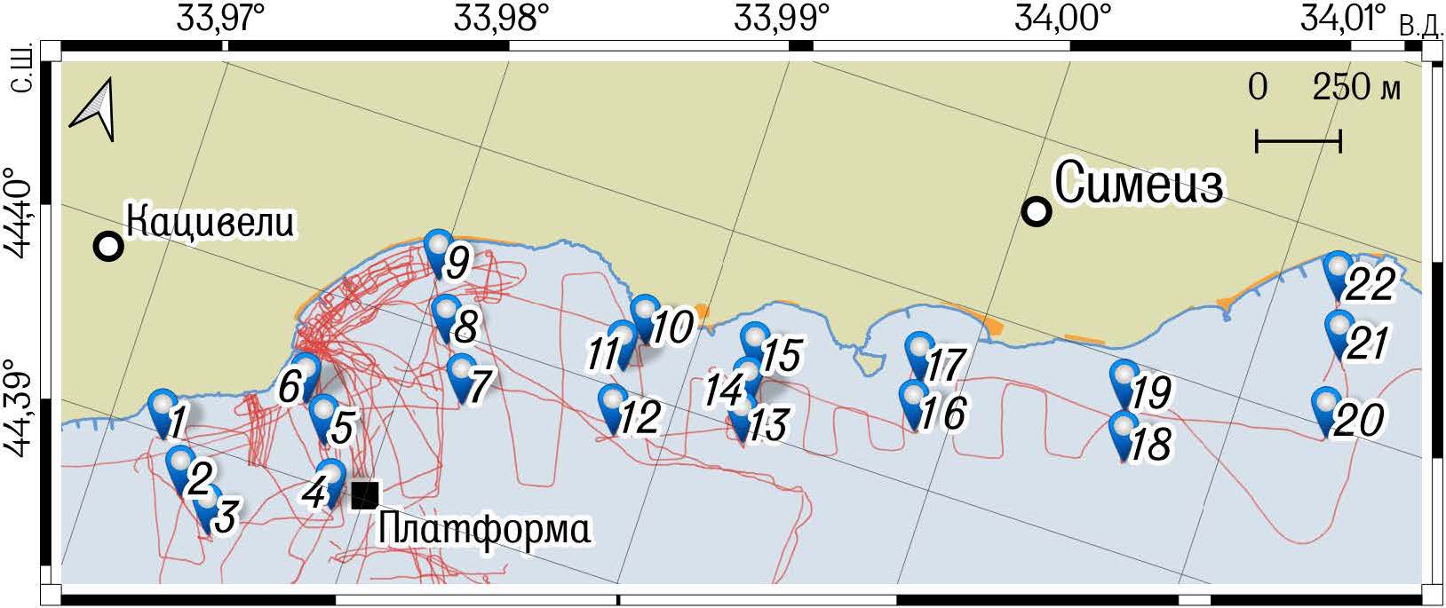 Рис.2. Схема района исследований. Синими маркерами показаны места отбора проб донных наносов, красной линией – треки гидроакустических исследований рельефа, оранжевые полигоны вдоль берега – муниципальные пляжи, черный квадрат – расположение океанографической платформы ЧГПП