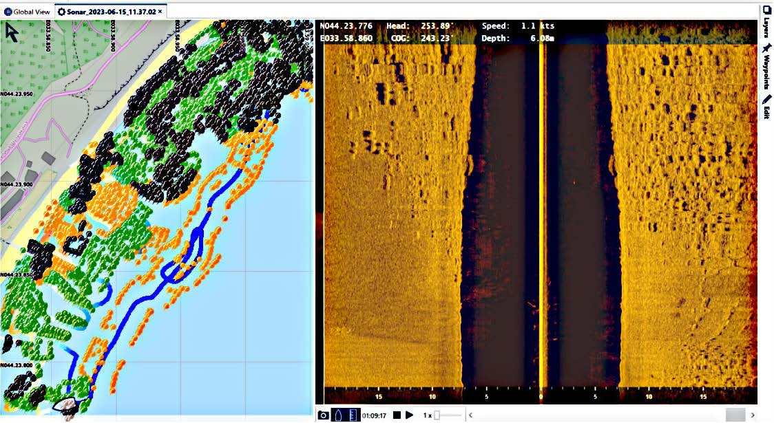 Fig.3. Example of SSS data analysis using the ReefMaster software: left – types of deposits, right – visualization of the SSS data scanning in time; boundary between the coarse and sandy deposits is clearly seen