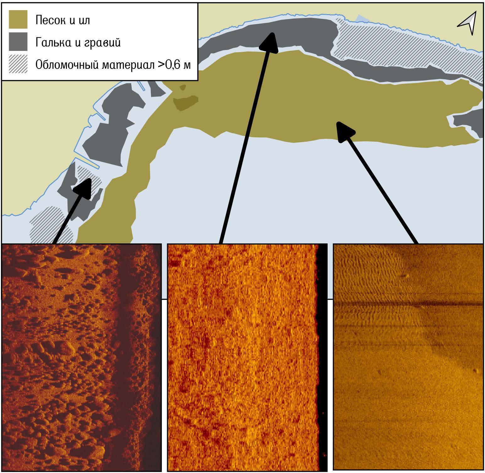 Как показано на рис. 5, донные наносы в прибрежной области (80–100 м по нормали от уреза воды до глубин 10–15 м) представляют собой поля крупного обломочного материала (> 0,6 м в диаметре) различной сплоченности, частично перемежающегося более мелкой фракцией гальки и гравия, частично перекрытого песчаными наносами. На мелководье грубообломочные отложения служат субстратом для макрофитов.