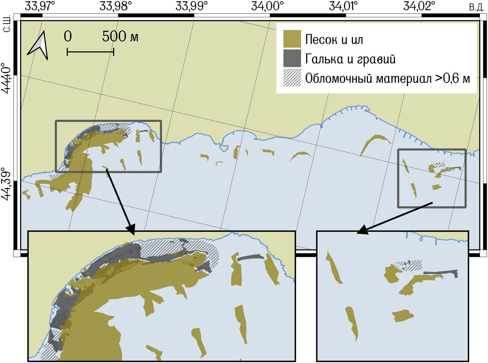 Именно поверхностный слой наносов на пляже и в приурезовой зоне моря определяет рекреационную привлекательность побережья, а на более глубоководных участках важен при мониторинге экологического состояния прибрежной зоны и при оценке геоморфологических характеристик участка побережья при планировании строительства [2, 3].