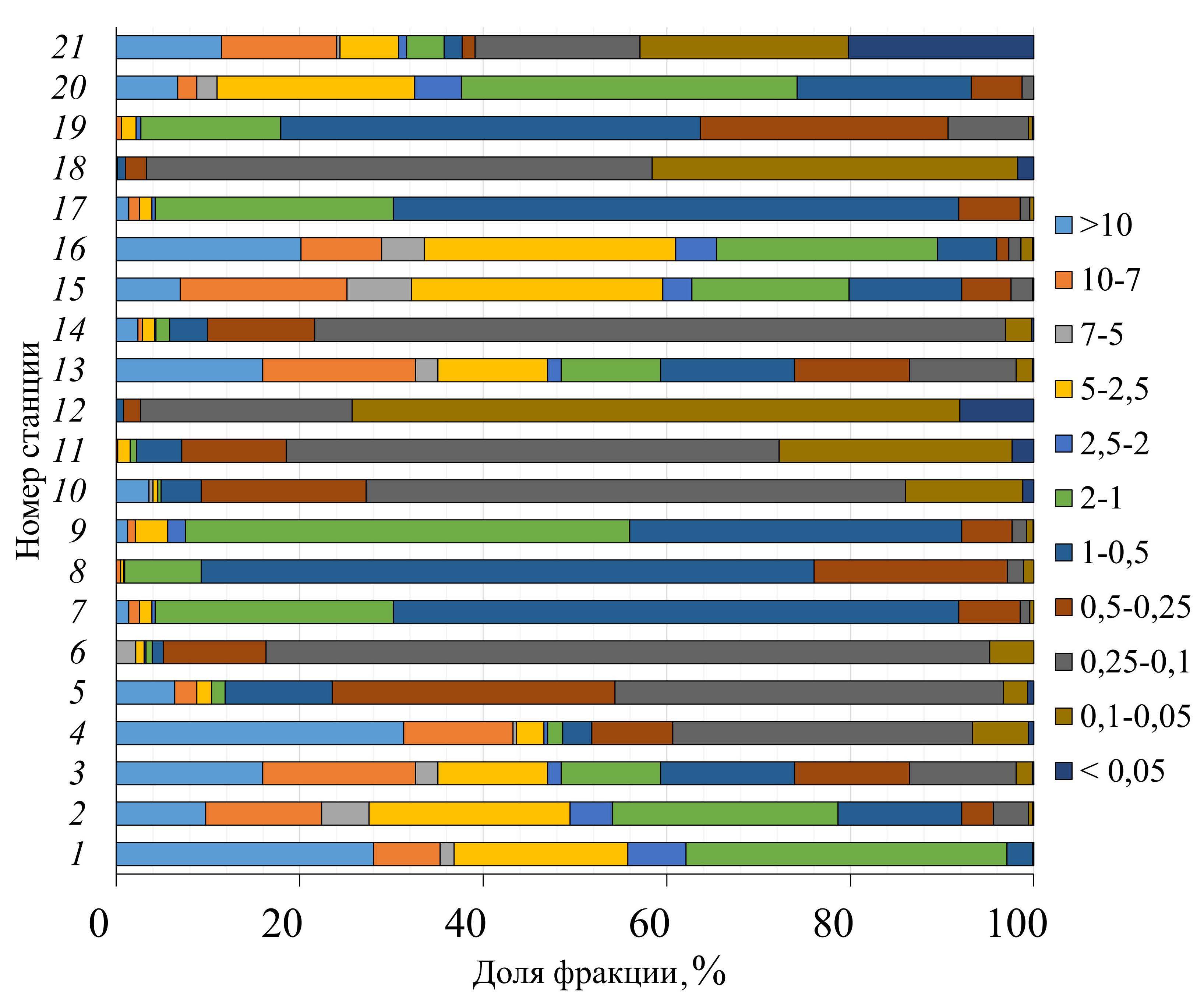 Отбор проб поверхностного слоя донных наносов (0–5 см), используемых для анализа в данной работе, осуществлялся в сентябре 2022 г. с помощью дночерпателя Петерсона с площадью охвата 0,025 м2. Схема станций отбора проб показана на рис. 1. Для исследования гранулометрического состава донных наносов применялся комбинированный ситовой анализ (метод декантации и рассеивания), который выполнялся с помощью набора сит с отверстиями 10; 7; 5; 2,5; 2; 1; 0,5; 0,25; 0,1; 0,05 мм. Сведения об отборе проб донных наносов и общее описание их состава приведены в табл. 1.