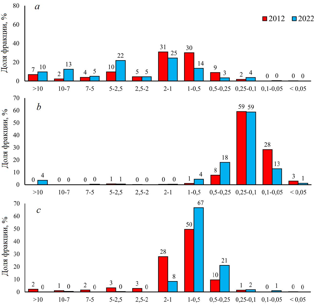 Fig.8. Comparison of the fractions of granulometric composition of bottom sediments in the Limenskaya Bay at stations 2 (а), 8 (b) and 10 (c) with the data obtained in 2012 [14]