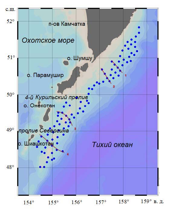 Положение разрезов показано на рис. 1 на фоне океанологических станций, выполненных в период рейса 30 апреля ‒ 3 мая 1996 г.: два – у юго-восточного берега Камчатки, один из них у самой юго-восточной оконечности полуострова, у Первого Курильского пролива, третий – в районе Четвертого Курильского пролива, разделяющего острова Парамушир и Онекотоан, и четвертый – в районе пролива Севергина между о-вами Харимкотан и Шиашкотан. Их можно считать стандартными (координаты станций были хотя и не строго фиксированными, но достаточно близкими).
