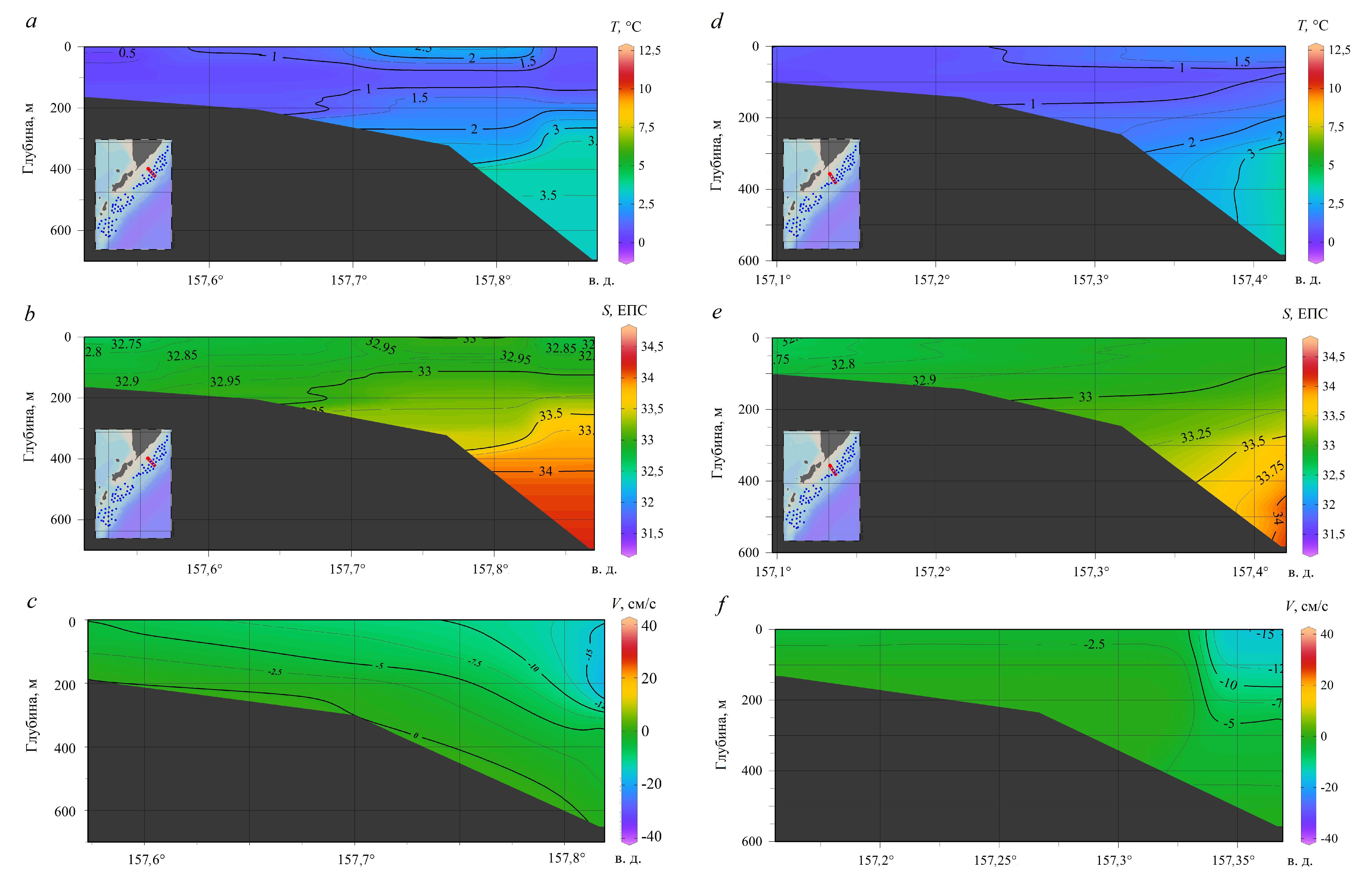 На разрезе 3 характер распределений температуры и солености отличается от расмотренных выше на разрезах, относившихся к юго-восточному побережью Камчатки (рис. 5). Здесь более теплая и менее соленая вода выявлена в восточной части разреза, в целом влияние хребта на распределение океанологических параметров очень выражено. При этом между о-вом Онеко-тан и хребтом Витязь ТПС практически отсутствует, ХПС достигает глубины около 500 м (его ядро с отрицательными значениями температуры морской воды находилось над хребтом). Изогалина 33 ЕПС проходила почти параллельно изотерме 4 °С, но на чуть большей глубине. Высокие значения солености к западу от подводного хребта не позволяют связать значительную толщину ХПС с влиянием охотоморской воды, соленость которой не достигает таких отметок.