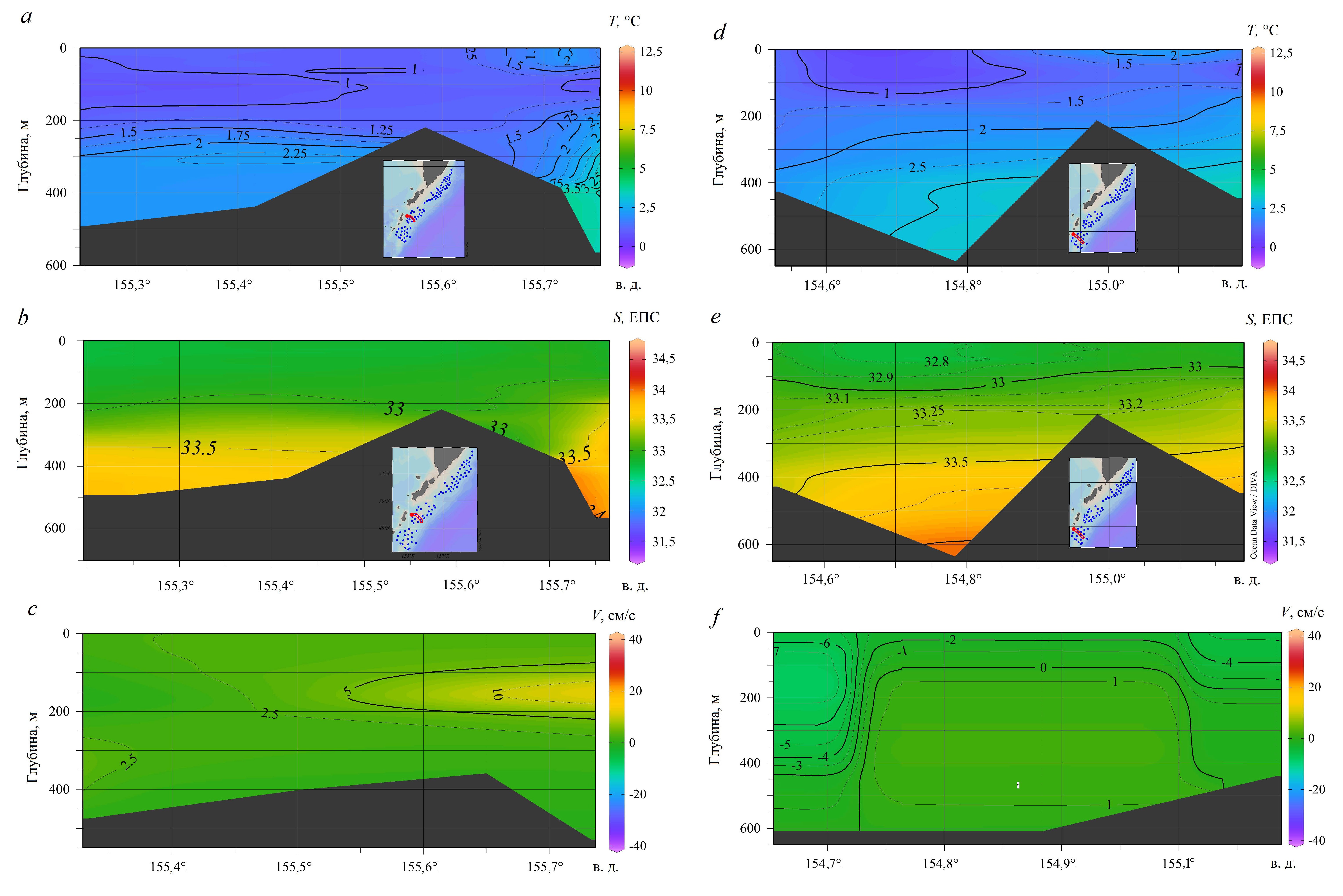 Несмотря на то что три из четырех выбранных разрезов примыкали к проливам Курильской гряды, влияние охотоморской воды, характеризующейся низкими значениями солености, не ощущалось даже в летний период, когда поток тихоокеанской воды через проливы северных Курильских островов ослаблен и можно было ожидать подобного эффекта.