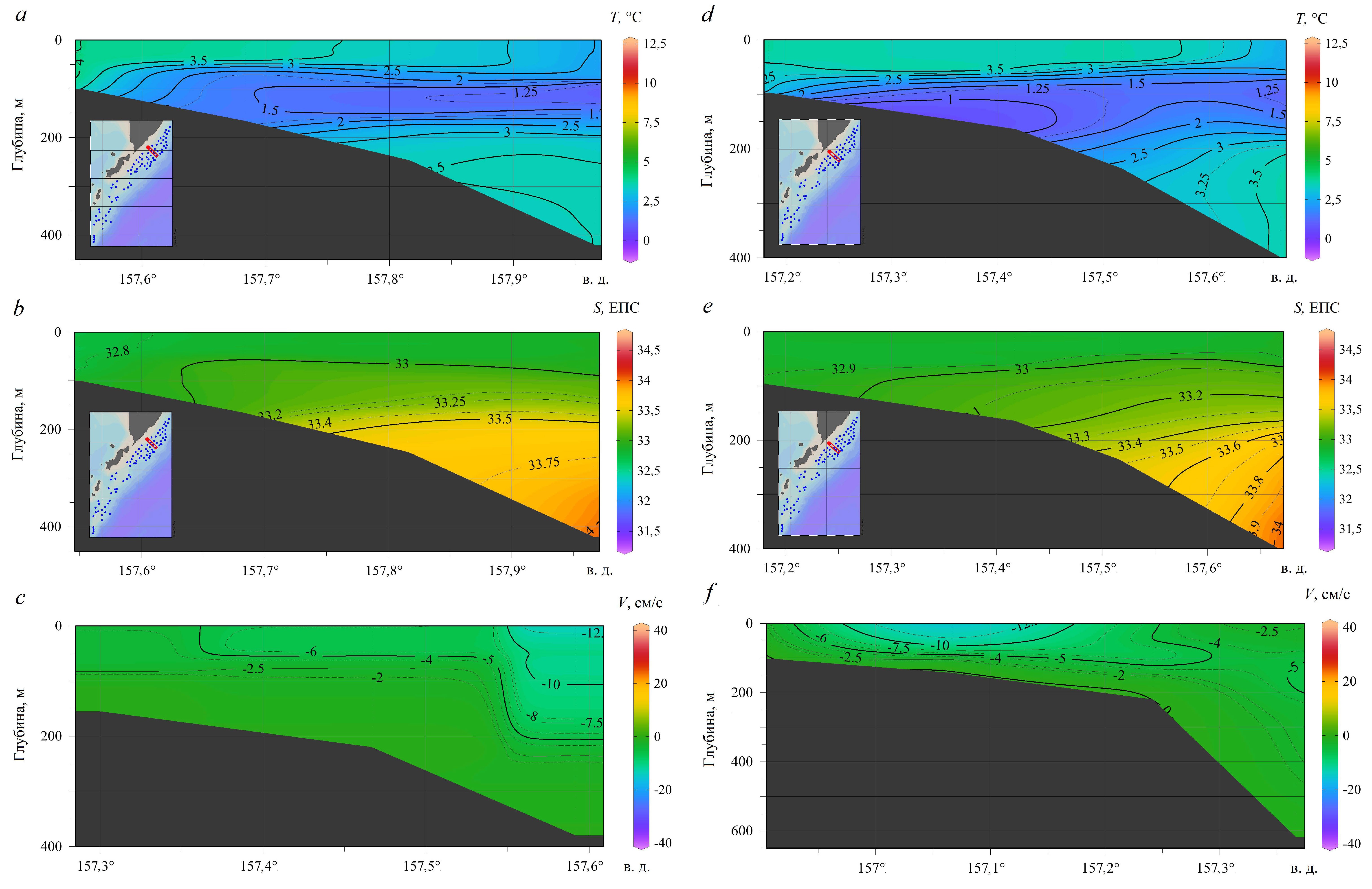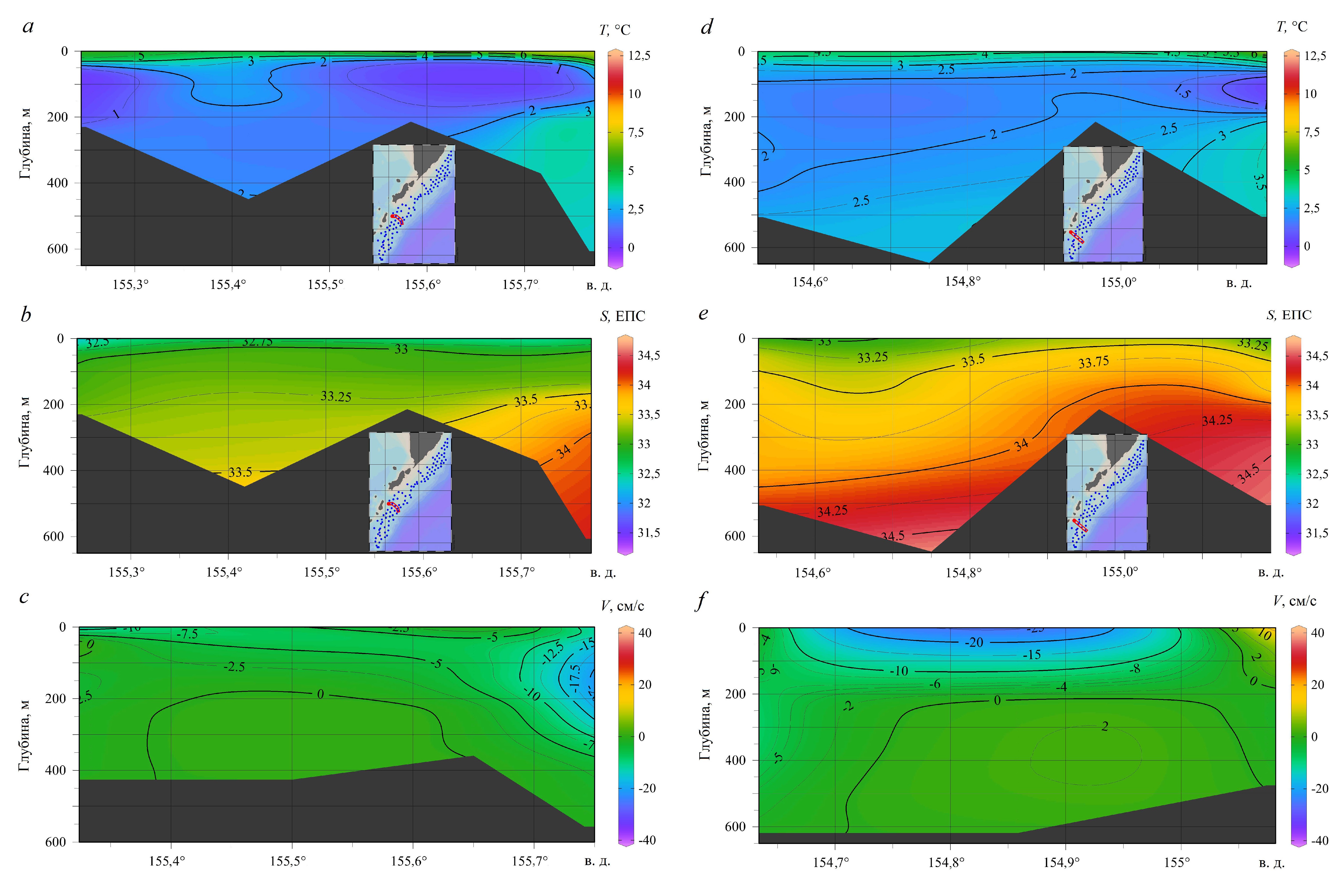 На рис. 4. представлены вертикальные распределения температуры и солености на разрезе 1. К середине июля тонкий поверхностный слой прогрелся до 5‒6 °С. По данным съемки четко выделяется ХПС, залегающий на глубинах от 50 до 200 м, температура в нем была менее 2 °С. На глубинах более 250 м температура возрастала до 3,5‒4 °С. Поверхностный слой характеризовался не только более высокими значениями температуры, но и низкой соленостью. В западной части в тонком поверхностном слое значения солености очень низкие для изучаемого района – 31,5 ЕПС и даже меньше. Наиболее вероятная причина формирования воды низкой солености на шельфе Юго-Восточной Камчатки ‒ это влияние таяния льда в юго-западной части Берингова моря и сток талой воды через Камчатский пролив. Определенную роль мог играть сток рек полуострова, однако устье основной реки Камчатки находится достаточно далеко от рассматриваемого разреза, поэтому влияние данного фактора менее вероятно. Изогалина 33 ЕПС залегала на глубине 60‒65 м в западной (прибрежной) части разреза и поднималась до 50 м в восточной. На глубинах более 200 м отмечена соленая вода (более 33,5 ЕПС).