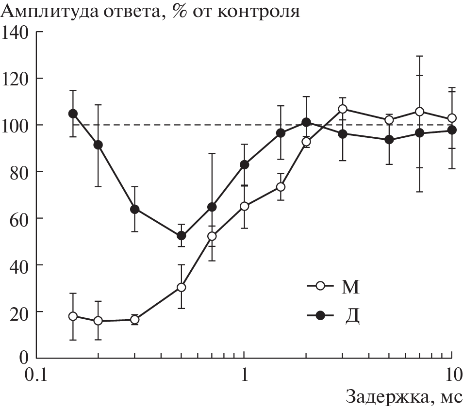 Неинвазивно регистрировали коротколатентные слуховые вызванные потенциалы (КСВП) у бутылконосого дельфина Tursiops truncatus на парные импульсные звуковые стимулы (кондиционирующий и тестирующий), подаваемые через излучатели, контактирующие с “акустическим окном” на нижней челюсти. Использовали две формы стимуляции: монауральную (оба стимула через один излучатель), или дихотическую (кондиционирующий и тестирующий стимулы подавали через разные излучатели, контактирующие один – с правым, другой – с левым акустическим окном). Кондиционирующий и тестирующий стимулы имели одинаковые характеристики, интервал между ними варьировал от 0.15 до 10 мс. При монауральной стимуляции подавление тестирующего ответа было одинаковым в диапазоне интервалов от 0.15 до 0.5 мс; при удлинении интервала ответ восстанавливался. При дихотической стимуляции наиболее глубокое подавление тестирующего ответа происходило при интервале 0.5 мс, а при более коротких или более длительных интервалах тестирующий ответ восстанавливался. Полное восстановление происходило при укорочении интервала до 0.15 мс и удлинении до 2 мс. Обсуждается значение полученных данных для эффекта предшествования и для работы биосонара дельфинов.