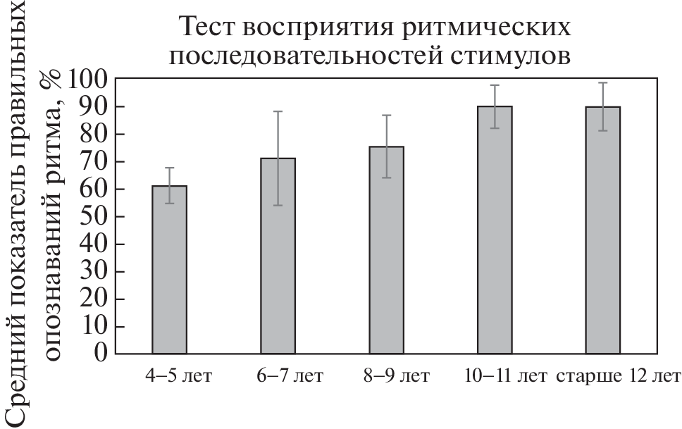 The age-appropriate development of the central auditory system is crucial for a child’s normal auditory and speech development. If there are any issues with this development, it can lead to central auditory processing disorders (APD) and problems with psychoverbal and general development. Psychoacoustic testing is an informative and accessible diagnostic tool for identifying signs of APD. This testing can be performed on children as young as four years old, provided there are normative data available for different age groups. The purpose of this study was to assess the functional state of the central auditory system using psychoacoustic methods in healthy children of different ages. Materials & Methods. We examined 125 healthy full-term children between the ages of 4 and 17 years who had normal peripheral hearing and no speech, language, cognitive, or academic problems. The children were divided into five age groups: 4–5 years 11 months, 6–7 years 11 months, 8–9 years 11 months, 10–11 years 11 months, and 12 years and older. In addition to traditional audiological examinations, all children underwent tests to assess the functional state of the central parts of the auditory system, including tests for the perception of rhythmic sequences of stimuli, Random Gap Detection Test, monaural low redundant speech testing in quiet and in noise, alternating binaural speech testing, dichotic digits test, and a simplified version of the Russian matrix sentence test in noise (RUMatrix). The results showed that the tests used were sensitive to the functional state of various structures of the central auditory system, and signs of maturation in the “bottom-up” direction were demonstrated as the children grew older. The rate of evolutionary processes varied depending on the age group of the subjects. It was also shown that the morphofunctional development of the central auditory system is not completed by adolescence. Conclusion. These findings can be used to differentiate between the immaturity of the central auditory system, APD, and speech-language disorders of different types in children of different ages. Overall, this study emphasizes the importance of early detection and intervention for any issues related to the central auditory system in children.