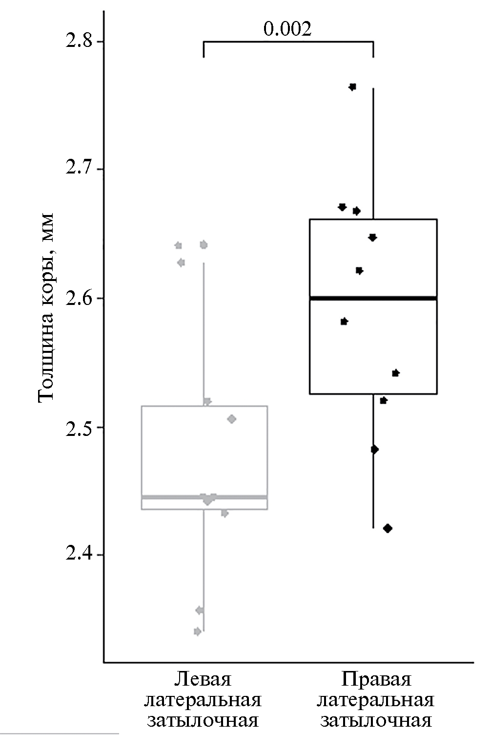 Рис. 2. Бокс-плоты показателей толщины коры в левой и правой латеральной затылочной коре (атлас Desikan et al., 2006).